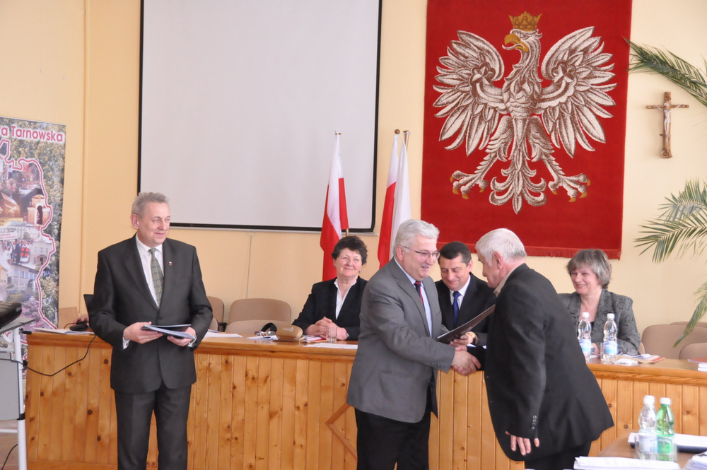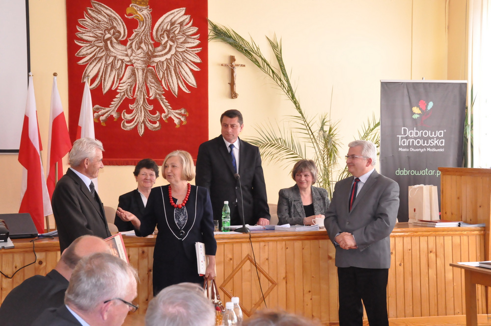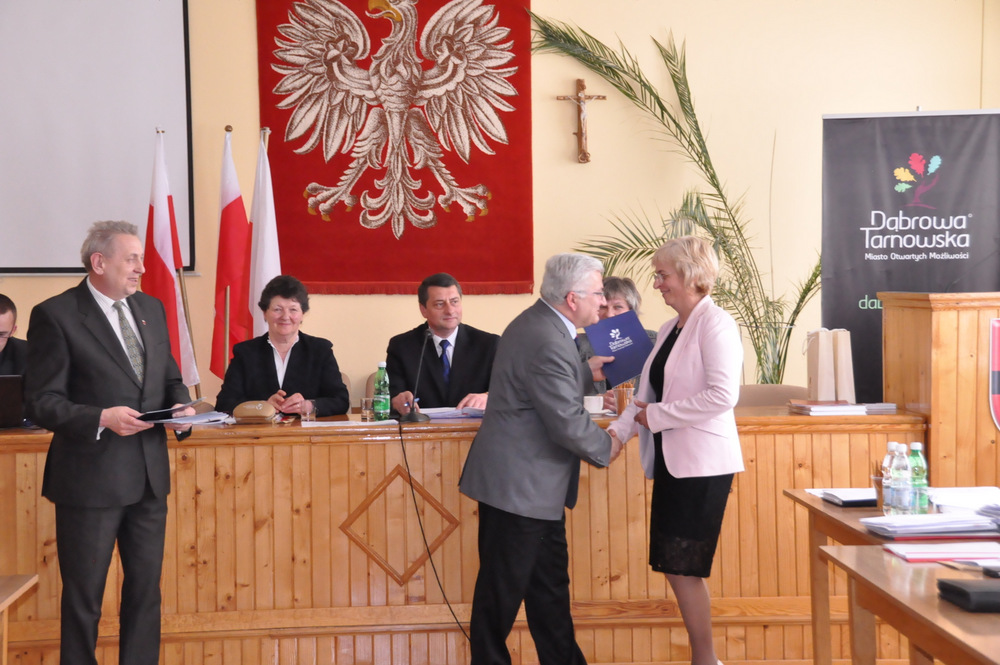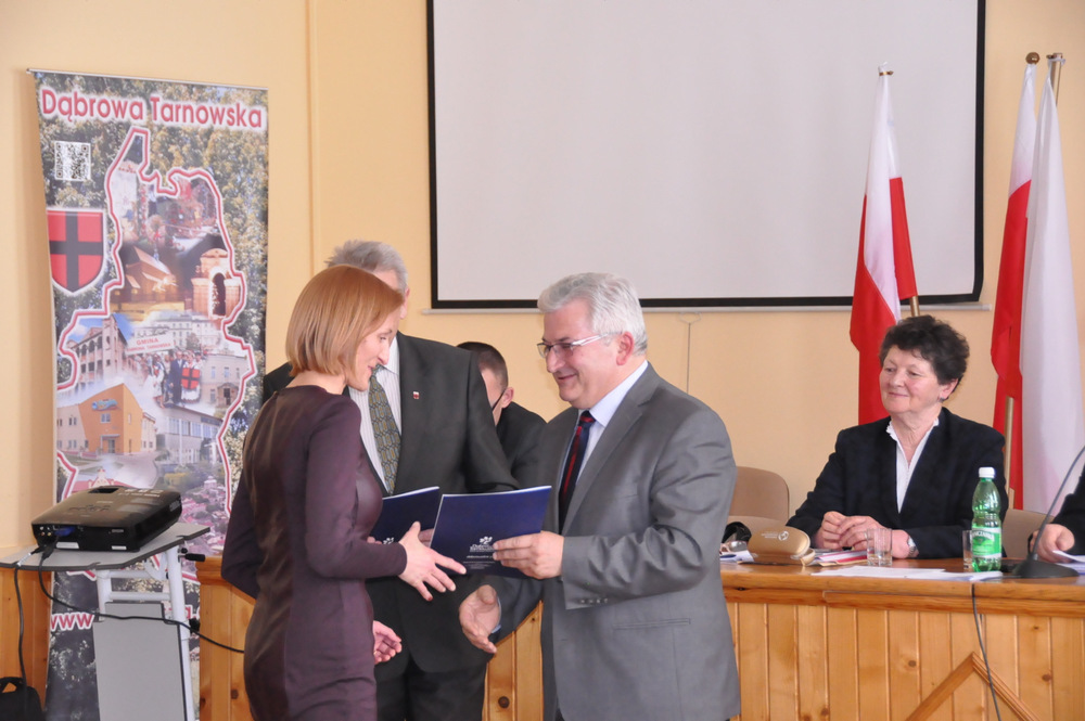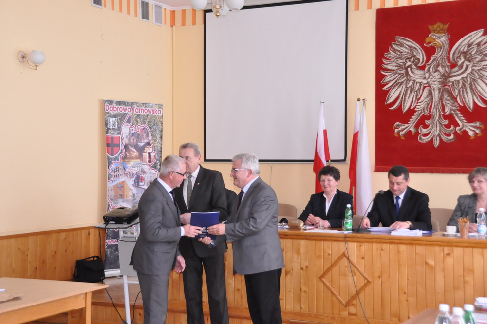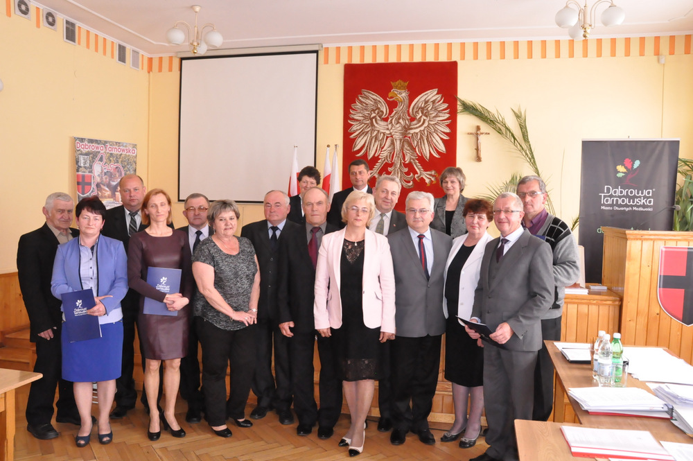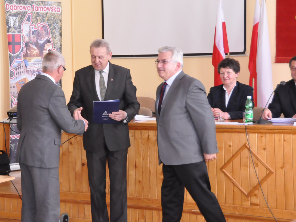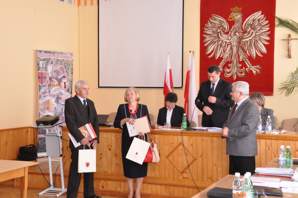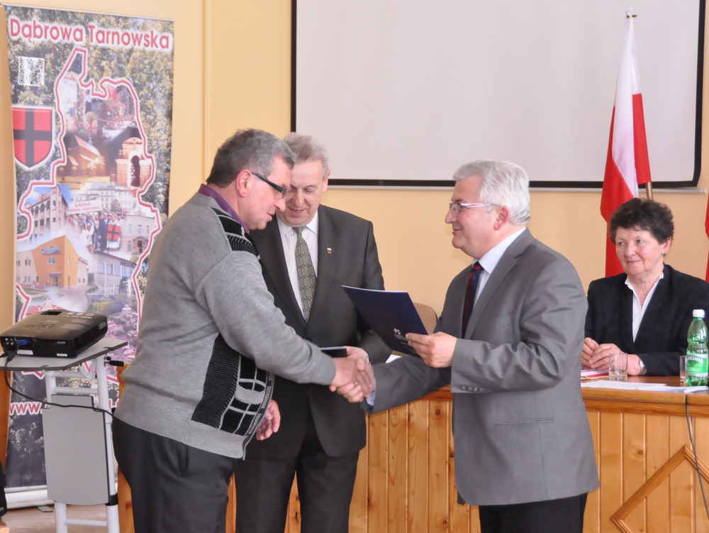 Następnie Burmistrz wraz z radnymi podziękowali sołtysom, którzy nie zostali wybrani na najbliższą kadencję tj. Pani Józefie Borowskiej – Marciniak, Zofii Świerczek, Janowi Sojce oraz Zdzisławowi Pyzikowi za oddaną i długoletnią pracę na rzecz lokalnej społeczności. W imieniu dchodzących sołtysów wystąpiła Pani Józefa Borowska –Marciniak, która podziękowała wszystkim za wieloletnią współpracę. Stanisław Ryczek jako Przewodniczący Miejskiej Komisji Wyborczej wręczył zaświadczenia nowo wybranym sołtysom, informując jednocześnie zebranych, że na kadencję 2015-2019 sołtysami sołectw Gminy Dąbrowa Tarnowska zostali: 1) Pan Stanisław Król - sołtys sołectwa Brnik, 2) Pani Barbara Chmiel – sołtys sołectwa Gruszów Mały, 3) Pani Józefa Taraska – sołtys sołectwa Gruszów Wielki, 4) Pan Jacek Świątek - sołtys sołectwa Laskówka Chorąska, 5) Pan Tadeusz Krawczyk – sołtys sołectwa Lipiny, 6) Pani Bernadeta Mrówka - sołtys sołectwa Morzychna, 7) Pan Czesław Podosek – sołtys sołectwa Nieczajna Dolna, 8) Pan Jan Bąba – sołtys sołectwa Nieczajna Górna, 9) Pan Ryszard Ciombor – sołtys sołectwa Smęgorzów, 10) Pani Halina Gąciarz - sołtys sołectwa Sutków, 11) Pani Marta Mędala - sołtys sołectwa Szarwark, 12) Pan Kazimierz Pinas – sołtys sołectwa Żelazówka.Na tej sesji radni przyjęli uchwałę w sprawie przyjęcia Programu osłonowego Gminy Dąbrowa Tarnowska w zakresie wsparcia dla rodzin wielodzietnych w ramach projektu „Pierwszy dzwonek” polegającego na przyznaniu dotacji dla gmin na udzielenie wsparcia na rok szkolny 2015/2016 dla uczniów z rodzin wielodzietnych 3+ z województwa małopolskiego. Radni przyjęli ocenę zasobów pomocy społecznej za rok 2014 dla Gminy Dąbrowa Tarnowska. Rada przyjęła sprawozdanie z realizacji programu współpracy Gminy Dąbrowa Tarnowska z organizacjami pozarządowymi oraz innymi podmiotami prowadzącymi działalność pożytku publicznego za rok 2014.