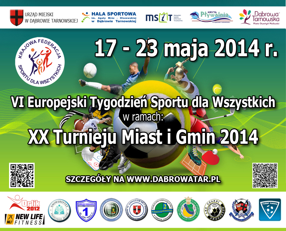Kryta Pływalnia w niedzielę 18.05.2014 również zaprasza od godziny 10:00 na zajęcia rodzinne w wodzie. Ponadto, wokół obiektów Orlik i Stadionu Miejskiego od godziny 14:00 rozpocznie się Miting Lekkoatletyczny o Puchar Burmistrza Dąbrowy Tarnowskiej. Wszystkich kibiców oraz miłośników siatkówki zapraszamy o godzinie 15:00 na Halę Sportową im Agaty Mróz – Olszewskiej, gdzie rozegrany zostanie finał Dąbrowskiej Amatorskiej Ligi Siatkówki.