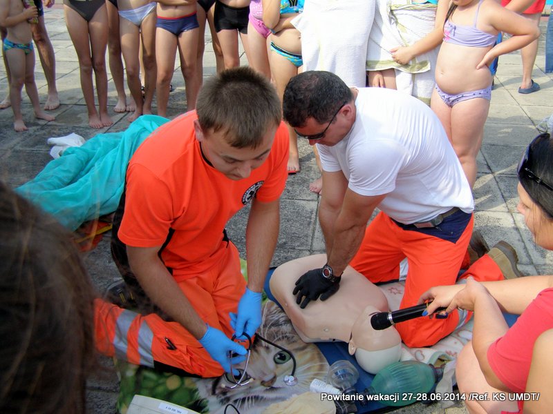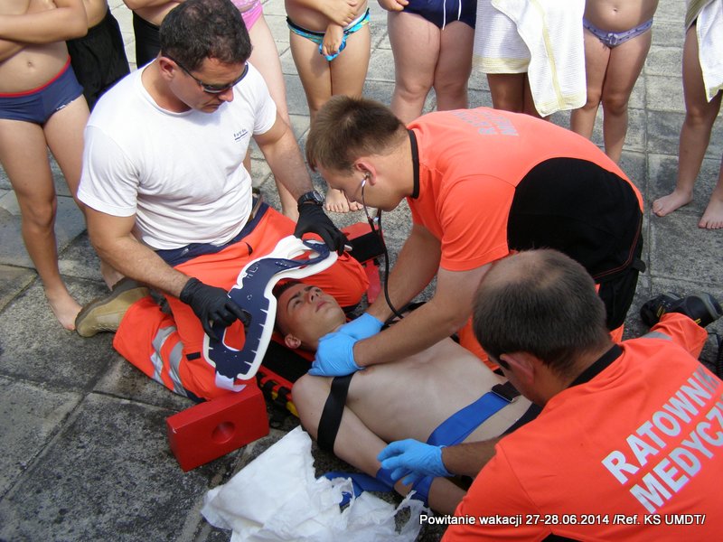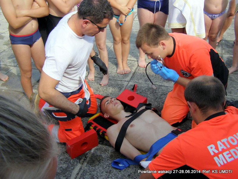 Dla miłośników rekreacji na świeżym powietrzu o godzinie 14:30 czekała kolejna propozycja. Panie Agnieszka Aksamit – Szułakiewicz i Justyna Kowalczyk z New Life Fitness przygotowały ogólnorozwojowe zajęcia, wzmacniające układ oddechowy, krążenia i mięśniowy przy użyciu piłek. 45 minutowe zajęcia choć do łatwych nie należały cieszyły się sporym zainteresowaniem oraz niewątpliwym zaangażowaniem ćwiczących. Po krótkiej przerwie do dalszej akcji wkroczyli Ratownicy WOPR oraz Ratownicy Medyczni Pogotowia Ratunkowego.