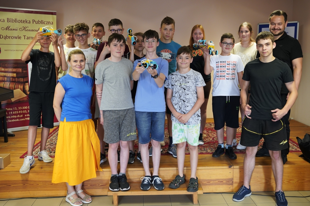 Dział dla Dorosłych i Młodzieży Miejskiej Biblioteki Publicznej im. Marii Kozaczkowej w Dąbrowie Tarnowskiej urozmaicił młodzieży czas wakacji. W poniedziałek 17 lipca br. odbyły się bezpłatne zajęcia pt. „Podstawy programowania oraz logicznego myślenia przy wykorzystaniu zestawu Lego Education Spike i gry edukacyjnej Scottie Go!” dla wszystkich chętnych uczniów w wieku 13-15 lat. Na początek uczestnicy sprawdzili wszystkie silniki i czujniki w zestawach klocków Lego Education Spike, następnie musieli stworzyć projekt w aplikacji Lego Spike Rower Treningowy Fitness. Konstrukcja była już wstępnie zaprogramowana tak, aby mogła zostać uruchomiona. Młodzież miała za zadanie ulepszyć zarówno sam model, jak i program. Twórczym wyzwaniem okazało się skonstruowanie maszyny jeżdżącej przy użyciu silników i elementów z zestawu klocków. Trzeba było zrobić to w taki sposób, aby mogła szybko nabrać prędkości. Młodzież z dużym zaangażowaniem pracowała w grupach wymieniając się uwagami i spostrzeżeniami. Kiedy drużyny zbudowały i zaprogramowały swoje pojazdy, odbył się wyścig. Zajęcia przyniosły dużą dawkę wiedzy zdobytej poprzez zabawę, dodatkowo urozmaiconą szczyptą zdrowej rywalizacji. Zajęcia przeprowadzili trenerzy Pracowni Aktywnego Korzystania z Technologii (PAKT) z Tarnowa. Założeniem projektu PAKT jest wspieranie nowoczesnego modelu nauczania i rozwijanie edukacji w obszarze kompetencji cyfrowych. Projekt jest finansowany ze środków Programu Operacyjnego Polska Cyfrowa, którego celem jest stworzenie przestrzeni do rozwoju kompetencji przyszłości wśród dzieci i dorosłych. Liderem projektu PAKT jest Centrum Projektów Polska Cyfrowa, a jednym z partnerów jest Stowarzyszenie „Miasta w Internecie” w Tarnowie obejmujące wsparciem teren Polski południowej. image022 Wakacyjne zajęcia z programowania w MBP w Dąbrowie Tarnowskiej image025 Wakacyjne zajęcia z programowania w MBP w Dąbrowie Tarnowskiej image036 Wakacyjne zajęcia z programowania w MBP w Dąbrowie Tarnowskiej image009 Wakacyjne zajęcia z programowania w MBP w Dąbrowie Tarnowskiej image010 Wakacyjne zajęcia z programowania w MBP w Dąbrowie Tarnowskiej image011 Wakacyjne zajęcia z programowania w MBP w Dąbrowie Tarnowskiej image012 Wakacyjne zajęcia z programowania w MBP w Dąbrowie Tarnowskiejimage015 Wakacyjne zajęcia z programowania w MBP w Dąbrowie Tarnowskiej