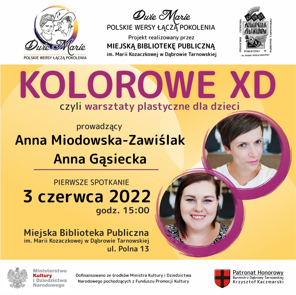 Bibliotekarki z Oddziału dla Dzieci Miejskiej Biblioteki Publicznej im. Marii Kozaczkowej w Dąbrowie Tarnowskiej Anna Gąsiecka i Anna Miodowska-Zawiślak zapraszają chętne dzieci w wieku 7-12 lat oraz młodsze dzieci wraz z rodzicami/opiekunami na warsztaty plastyczne organizowane w ramach realizacji projektu "Dwie Marie - polskie wersy łączą pokolenia". Warsztaty plastyczne pt. "KOLOROWE XD" odbędą się w dwóch terminach: w piątki 3 i 10 czerwca w godzinach 15:00-17:00 (o ewentualnej zmianie terminów zgłoszeni uczestnicy informowani będą bezpośrednio). Podczas zajęć wykonane zostaną projekty i stylizacje ubiorów scenicznych oraz konstruowane będą lalki teatralne do jesiennego spektaklu "Niezły raban na wesoło... przy Polnej", który będzie efektem także wielu innych warsztatów (literackich - scenariusz, plastycznych – scenografia, muzycznych - oprawa dźwiękowa oraz aktorskich - dla osób odgrywających role w przedstawieniu). Informacje o warsztatach teatralnych po wakacjach. OBOWIĄZUJĄ WCZEŚNIEJSZE ZAPISY pod nr tel. 14 655 93 03 wew.17 lub bezpośrednio w Oddziale dla Dzieci. Projekt "Dwie Marie - polskie wersy łączą pokolenia" dofinansowano ze środków Ministra Kultury i Dziedzictwa Narodowego pochodzących z Funduszu Promocji Kultury w ramach programu Partnerstwo dla książki. kolorowe 2 Warsztaty plastyczne w MBP zaproszenie