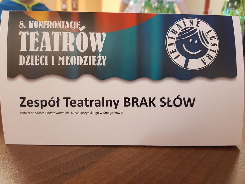 W dniach 14 -16 maja 2019 roku w sali widowiskowej Regionalnego Centrum Kulturalno–Bibliotecznego im. Jana Pawła II w Brzesku odbyły się 8. Konfrontacje Teatrów Dzieci i Młodzieży "Teatralne Lustra".  Jest to  prestiżowy projekt teatralno-edukacyjny, który ma na celu prezentację dokonań teatrów dziecięcych i młodzieżowych z subregionu tarnowskiego, promocję  i wspieranie teatralnej twórczości dzieci i młodzieży. W tym roku wszystkie przedstawienia oceniał zespół konsultantów w składzie: Anna Lenczewska – aktorka, absolwentka krakowskiej PWST, od kilkunastu lat związana z krakowskim Teatrem Mumerus, Paweł  Kumięga – aktor Teatru Ludowego w Krakowie oraz  Karol Polak – aktor Teatru Ludowego w Krakowie. Z dumą informujemy, że grupa teatralna "Brak słów" ze Szkoły Podstawowej im. Kornela Makuszyńskiego w Smęgorzowie, której opiekunami są panie Alicja Bańbor oraz Justyna Bociek otrzymała nagrodę za kolosalną zabawną i pełną dwuznaczności zwierzęcą interpretację ludzkiego świata w spektaklu pt."Inne kaczątko". Wielkie zaangażowanie ze strony uczestników  grupy i ogrom pracy jaką włożyli w przygotowanie spektaklu zostały dostrzeżone i docenione przez przedstawicieli jury. Grupa teatralna ze Smegorzowa zdobyła także nagrodę finansową w wysokości 700 złotych! Do sukcesu przyczyniła się wspaniała ekipa techniczna w składzie: Anna Krawczyk, Karolina Krzak oraz Agnieszka Chmura. Panie  niestrudzenie wspomagały ekipę teatralną  podczas prób i występów.