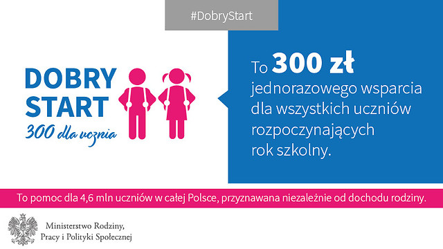1 lipca rozpoczął się nabór wniosków o świadczenie „Dobry start” – w tym roku wyłącznie online. Do tej pory rodzice i opiekunowie złożyli już milion wniosków. – To bardzo dobry wynik i dowód na to, że coraz rzadziej mamy opory z korzystania z dobrodziejstw sieci załatwiając różne sprawy, również wnioskując o świadczenia takie jak „Dobry start” czy „Rodzina 500+” – mówi minister rodziny i polityki społecznej Marlena Maląg. Program „Dobry start” to 300 zł na każde uczące się w szkole dziecko w wieku od 7 do 20 roku życia, a w przypadku dzieci z niepełnosprawnościami – do 24 roku życia.