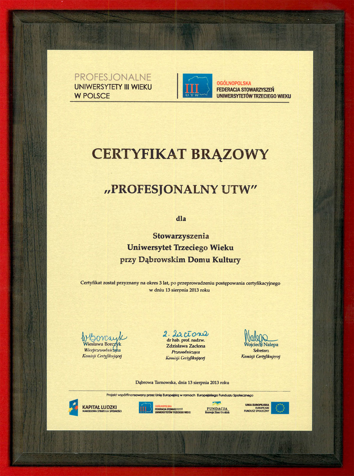 W piątek 29 listopada 2013 r. na III Małopolskim Forum Uniwersytetu Trzeciego Wieku w Krakowie nastąpiło uroczyste wręczenie przyznanego wcześniej przez Komisję Certyfikującą – Certyfikatu „Profesjonalny Uniwersytet Trzeciego Wieku”. Stowarzyszenie Uniwersytet Trzeciego Wieku przy Dąbrowskim Domu Kultury otrzymało BRĄZOWY CERTYFIKAT „PROFESJONALNY UTW”. W imieniu dąbrowskiego Stowarzyszenia UTW certyfikat odebrała z rąk Ministra Pracy i Polityki Społecznej – Władysława Kosiniaka-Kamysza, Pani Maria Gdowska – Sekretarz Stowarzyszenia. Stowarzyszenie UTW przy Dąbrowskim Domu Kultury znalazło się w gronie trzynastu Uniwersytetów Trzeciego Wieku w skali kraju, które uzyskały certyfikat. Wszystkich Uniwersytetów Trzeciego Wieku jest obecnie w Polsce około 450.