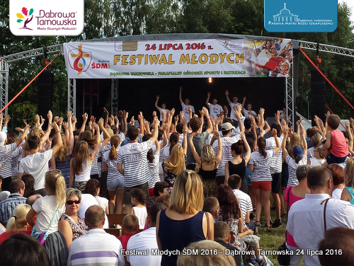 W niedzielę 24 lipca br. na terenie Parafialnego Ośrodka Sportu i Rekreacji im. 25-lecia Pontyfikatu Jana Pawła II w Dąbrowie Tarnowskiej odbywał się Festiwal Młodych a zarazem koncert ewangelizacyjny dąbrowskiej części Tygodnia Misyjnego Światowych Dni Młodzieży. W programie wydarzenia integrującego społeczność lokalną z przebywającymi w dąbrowskiej parafii Gośćmi Światowych Dni Młodzieży przygotowano bloki muzyczne, zabawy i tańce dla dzieci. Goście z Francji zaprezentowali spektakl teatralny ukazujący nam bogatą historię Kościoła Katolickiego ich kraju, który wydał wielu niezwykłych świętych. Kulminacją dąbrowskiego Festiwalu Młodych było  uwielbienie Jezusa i adoracja eucharystyczna. Koncert prowadził ks. Marek Zembura, główny koordynator Światowych Dni Młodzieży w parafii NMP Szkaplerznej w Dąbrowie Tarnowskiej. Pomocą służyli mu tłumacze-wolontariusze. Uczestnicy zostali przywitani przez Ks. Proboszcza Stanisława Cyrana oraz Burmistrza Dąbrowy Tarnowskiej Krzysztofa Kaczmarskiego. Wśród zebranych obecny był także Starosta Dąbrowski Tadeusz Kwiatkowski.