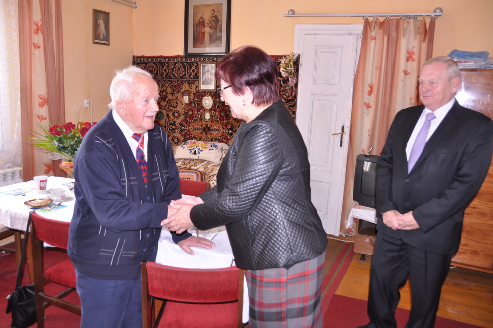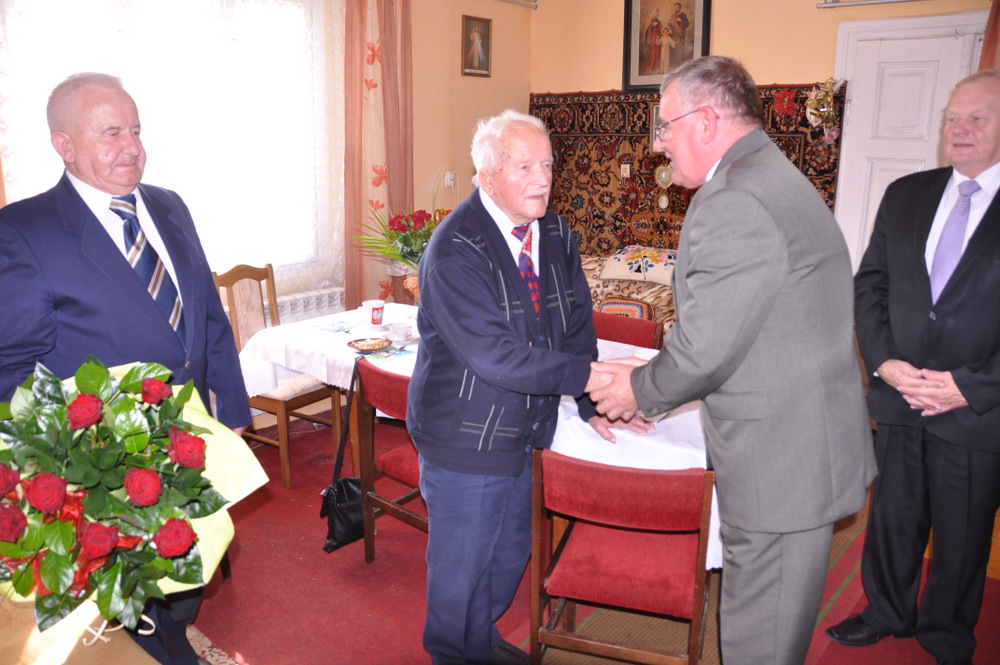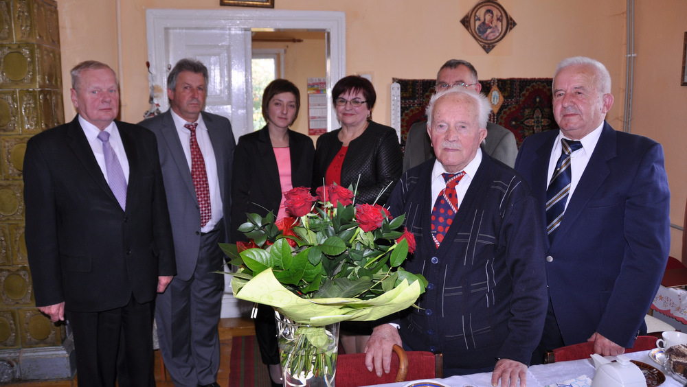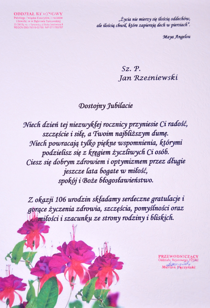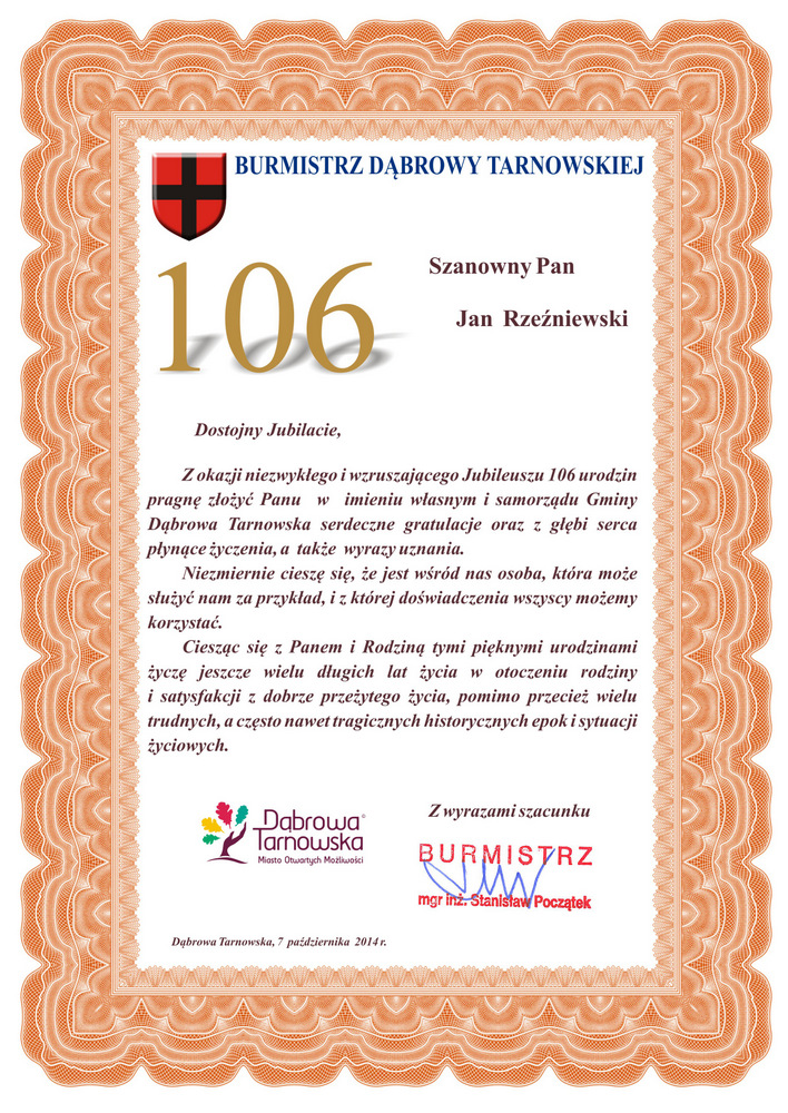 Z okazji tak niezwykłej rocznicy urodzin przekazano Jubilatowi najszczersze gratulacje i życzenia zdrowia, radości i serdecznej opieki na dalsze lata życia. Nie każdemu dane jest przeżyć tak piękne urodziny, doczekać tak sędziwego wieku. Pan Jan cieszy się jak na swój wiek nadal dobrym zdrowiem. Może pochwalić się doskonałą pamięcią, świeżością umysłu i pogodą ducha. Dostojny Jubilat z uśmiechem przyjmował życzenia i witał gości. Pan Jan Rzeźniewski urodził się 7 października 1908 r. w Smęgorzowie, syn Jana i Marii z domu Kowal. Ukończył 8-letnie Gimnazjum w Dąbrowie Tarnowskiej, następnie studiował w Kielcach. Zna i pamięta grekę, łacinę, język niemiecki i podstawy języka hebrajskiego. Po wybuchu drugiej wojny światowej został wcielony do wojska, udało mu się jednak uciec z transportu do ZSRR. Po długiej tułaczce wrócił w rodzinne strony. W okresie okupacji Pan Jan pracując zawodowo, wspierał AK i działał w konspiracji. Jako żołnierz AK otrzymał stopień porucznika. Po wojnie krótko pracował w Technikum Rolniczym w Brniu, był kierownikiem internatu i uczył łaciny. Wraz z ks. Stanisławem Skirło ze Smęgorzowa założył Spółdzielnię Mleczarską w Smęgorzowie, gdzie pełnił funkcję prezesa. Później Pan Jan pracował przez wiele lat w Powszechnej Spółdzielni Spożywców w Dąbrowie Tarnowskiej. W 1942 r. zawarł związek małżeński z Zofią Ligęza. Żona Zmarła w 2005 r.