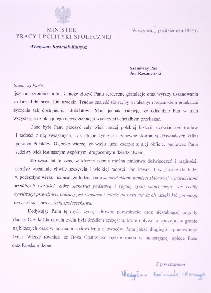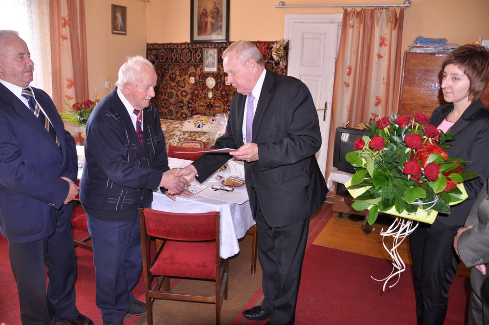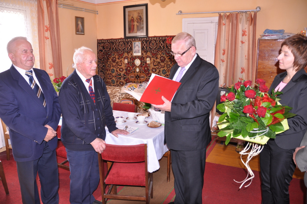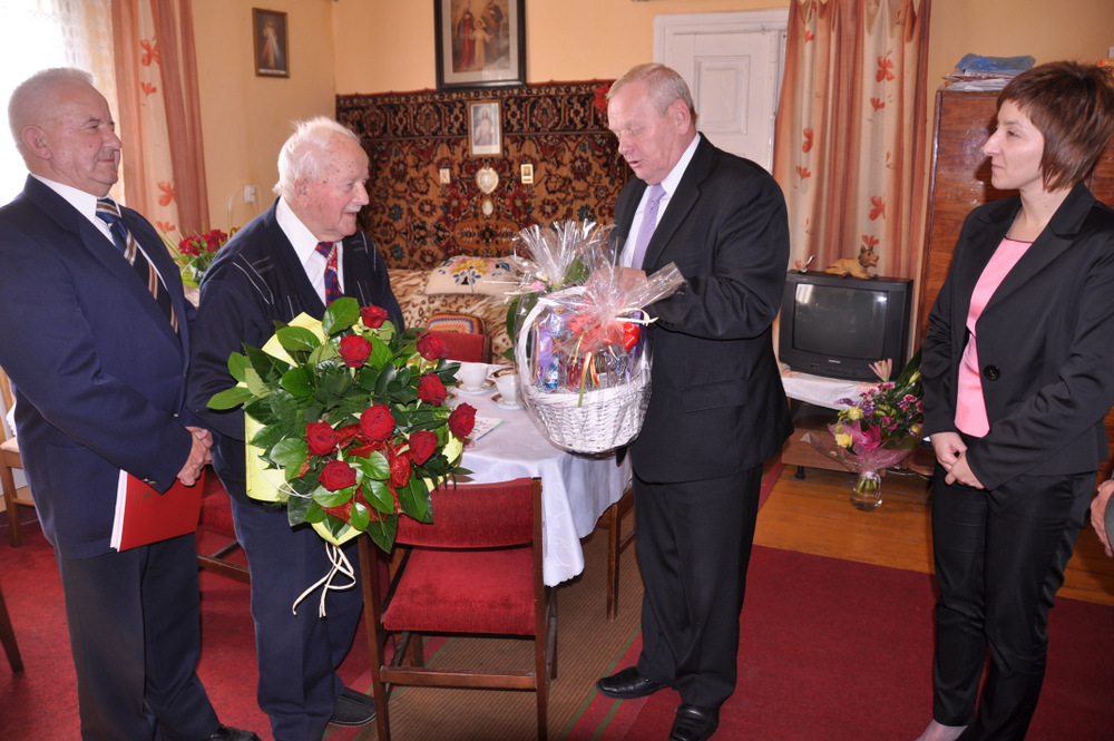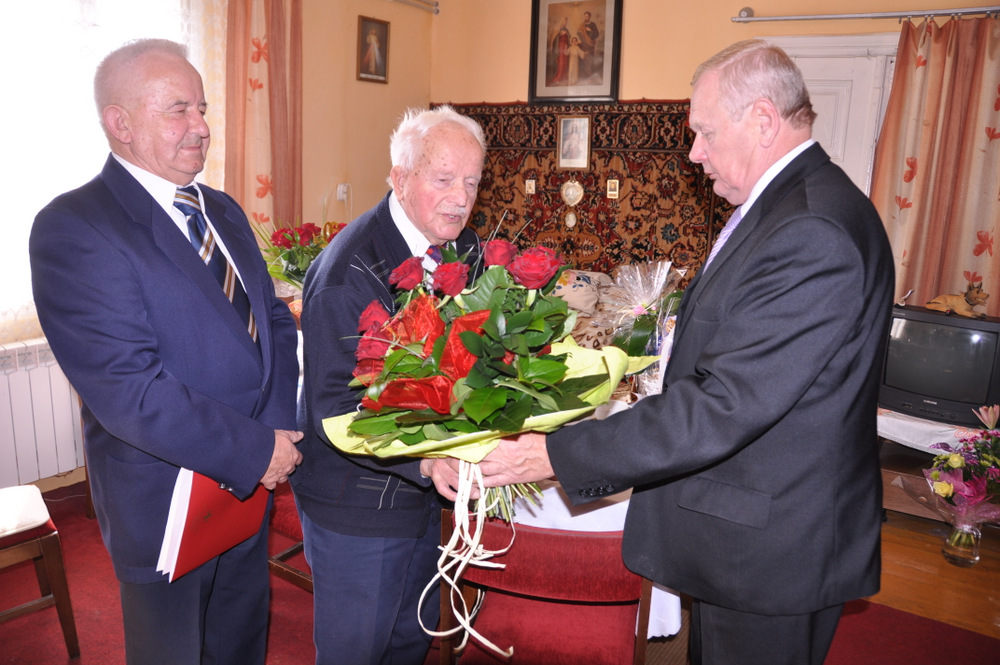 Z okazji tak niezwykłej rocznicy urodzin przekazano Jubilatowi najszczersze gratulacje i życzenia zdrowia, radości i serdecznej opieki na dalsze lata życia. Nie każdemu dane jest przeżyć tak piękne urodziny, doczekać tak sędziwego wieku. Pan Jan cieszy się jak na swój wiek nadal dobrym zdrowiem. Może pochwalić się doskonałą pamięcią, świeżością umysłu i pogodą ducha. Dostojny Jubilat z uśmiechem przyjmował życzenia i witał gości. Pan Jan Rzeźniewski urodził się 7 października 1908 r. w Smęgorzowie, syn Jana i Marii z domu Kowal. Ukończył 8-letnie Gimnazjum w Dąbrowie Tarnowskiej, następnie studiował w Kielcach. Zna i pamięta grekę, łacinę, język niemiecki i podstawy języka hebrajskiego. Po wybuchu drugiej wojny światowej został wcielony do wojska, udało mu się jednak uciec z transportu do ZSRR. Po długiej tułaczce wrócił w rodzinne strony. W okresie okupacji Pan Jan pracując zawodowo, wspierał AK i działał w konspiracji. Jako żołnierz AK otrzymał stopień porucznika. Po wojnie krótko pracował w Technikum Rolniczym w Brniu, był kierownikiem internatu i uczył łaciny. Wraz z ks. Stanisławem Skirło ze Smęgorzowa założył Spółdzielnię Mleczarską w Smęgorzowie, gdzie pełnił funkcję prezesa. Później Pan Jan pracował przez wiele lat w Powszechnej Spółdzielni Spożywców w Dąbrowie Tarnowskiej. W 1942 r. zawarł związek małżeński z Zofią Ligęza. Żona Zmarła w 2005 r.