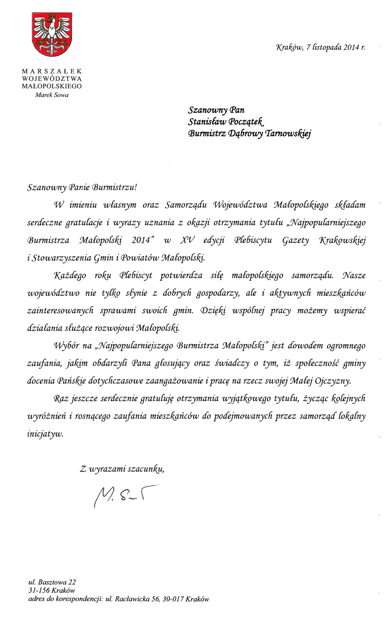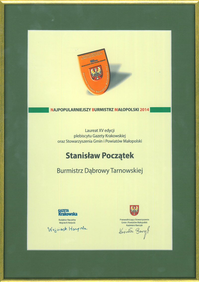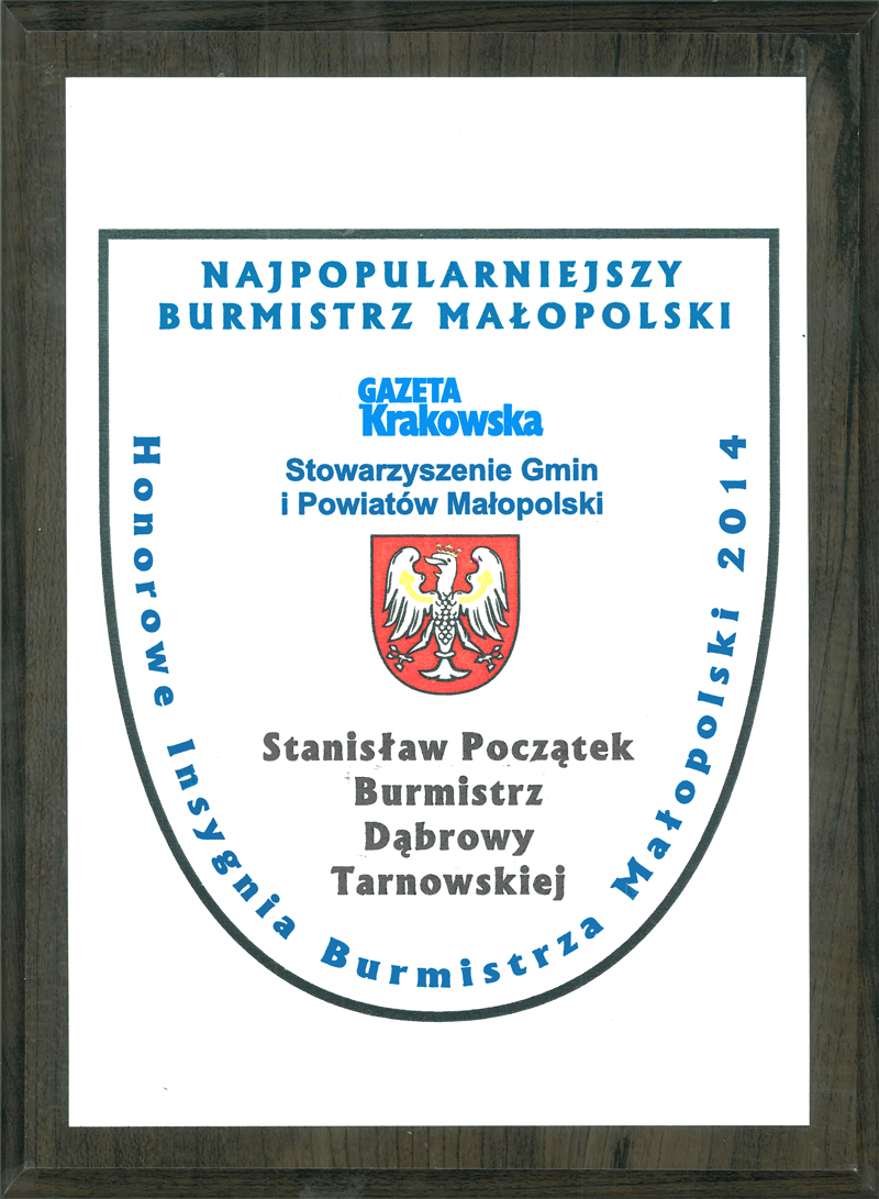 Zakończył się plebiscyt „Najpopularniejszy wójt i burmistrz Małopolski”, który zorganizowała Gazeta Krakowska oraz Stowarzyszenie Gmin i Powiatów Małopolski. Do plebiscytu Czytelnicy zgłosili 66 wójtów i 30 burmistrzów. Zgodnie z regulaminem wybrano 10 wójtów i 5 burmistrzów, którzy uzyskali najwięcej głosów. Głosowanie odbywało się w październiku przy pomocy kuponów drukowanych w GK a także za pomocą SMS. Dziś, to jest 7 listopada br. w Krakowie miała miejsce uroczysta gala, na której ogłoszono oficjalne wyniki. Najpopularniejsi wójtowie otrzymali kapelusze, a najpopularniejsi burmistrzowie insygnia władzy i dyplomy. Wśród pięciu najpopularniejszych burmistrzów jest burmistrz Dąbrowy Tarnowskiej Stanisław Początek. W piątce laureatów są jeszcze burmistrzowie; Krynicy Zdroju, Radłowa, Bobowej i Wieliczki.