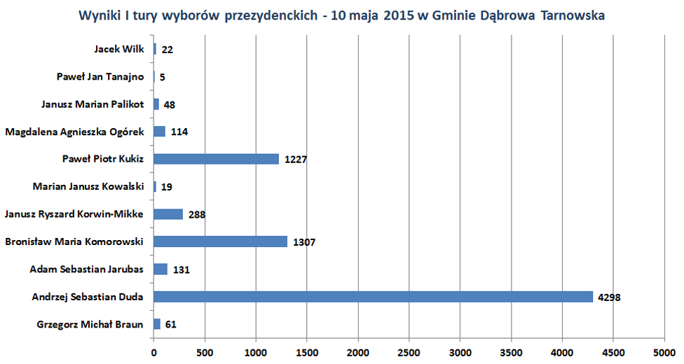 Podobnie jak w prawie 26 tysiącach w całej Polsce tak i w 20  obwodowych komisjach wyborczych o godz. 7:00 rozpoczęły się w Gminie Dąbrowa Tarnowska Wybory Prezydenta Rzeczypospolitej Polskiej. Po ogłoszeniu wstępnych wyników przez Państwową Komisję Wyborczą –  była to I tura tychże wyborów. Do godz. 21:00. dokonywano wyboru spośród 11 kandydatów. Uprawnionych do głosowania w naszej gminie było 16992 osób. Do urn wyborczych udało się 7589 uprawnionych do głosowania, co dało 44,66 % frekwencję w Gminie Dąbrowa Tarnowska. W gminie Dąbrowa Tarnowska najwięcej głosów – 4298 – otrzymał Andrzej Duda reprezentujący Prawo i Sprawiedliwość, czyli 56,63%. Drugi wynik – odnotował Bronisław Komorowski, popierany przez  Platformę Obywatelską otrzymując 1307 głosów, czyli 17,22 %. W naszej gminie głosowano w 20 Obwodowych Komisjach Wyborczych, tj., 7 miejskich, jedenastu wiejskich i dwóch obwodach zamkniętych ( DPS Hospicjum i ZOZ Szpital). Przed nami II tura wyborów na najwyższy urząd w państwie – urząd Prezydenta RP – 24 maja 2015 r., na ww. dwóch kandydatów które odbędą się w tych samych lokalach wyborczych.