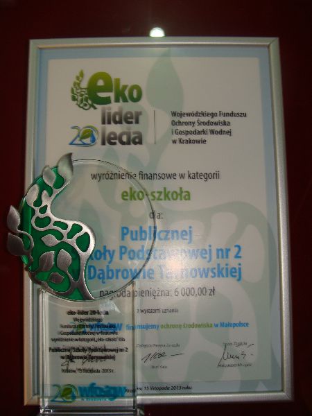 Publiczna Szkoła Podstawowa nr 2 w Dąbrowie Tarnowskiej została wyróżniona jako jedyna placówka z naszej gminy i powiatu spośród ponad 80 zgłoszeń konkursowych. Doceniono szereg działań, które na przestrzeni lat Szkoła podejmowała i nadal kontynuuje na rzecz przygotowania młodego pokolenia do ochrony i kształtowania środowiska życia człowieka.