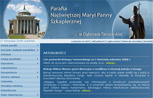 Dziś została uruchomiona strona internetowa parafii pw. NMP Szkaplerznej w Dąbrowie Tarnowskiej. Zawiera ona bardzo wiele przydatnych informacji związanych z historią i dniem dzisiejszym naszej parafii, praktyczne informacje kancelaryjne, ogłoszenia duszpasterskie, intencje mszalne na nowy tydzień. Strona będzie systematycznie uzupełniana przez ks. prefekta Henryka Kołodzieja, który zbudował stronę i będzie czuwał nad jej aktualizacją wraz z Krzysztofem Orwatem. Adres strony: www.dt.diecezja.tarnow.pl .