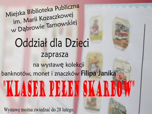 Oddział dla Dzieci przygotował wystawę pod hasłem „Klaser pełen skarbów”, na którą składają się znaczki pocztowe, monety i banknoty. Kolekcja jest własnością Filipa Janika, ucznia klasy VIII Szkoły Podstawowej nr 2 im. Mikołaja Kopernika w Dąbrowie Tarnowskiej. Pokaźny zbiór zawiera m.in. znaczki z postaciami bajkowymi, znakami zodiaku, pojazdami czy naturą. Wśród monet, które można podziwiać znajduje się wiele okolicznościowych, np. wydanych z okazji 65. rocznicy oswobodzenia KL Auschwitz-Birkenau, 95. rocznicy wymarszu Pierwszej Kompanii Kadrowej czy 100. rocznicy Harcerstwa Polskiego. Wieloletni czytelnik dąbrowskiej książnicy posiada w swej kolekcji około 74 monety i jeszcze więcej znaczków pocztowych, a jego kolekcja wciąż się rozwija.