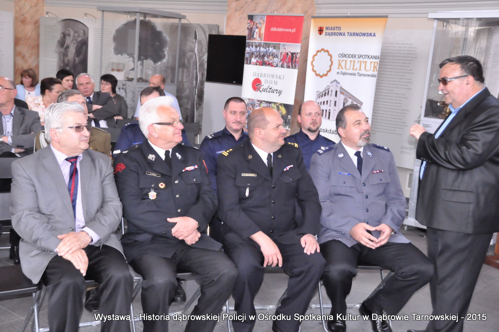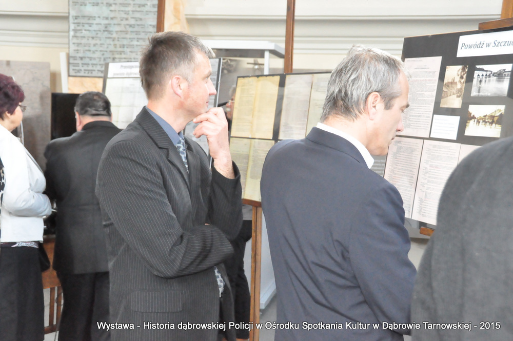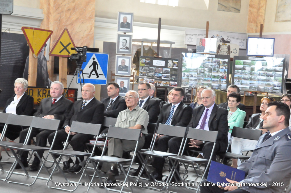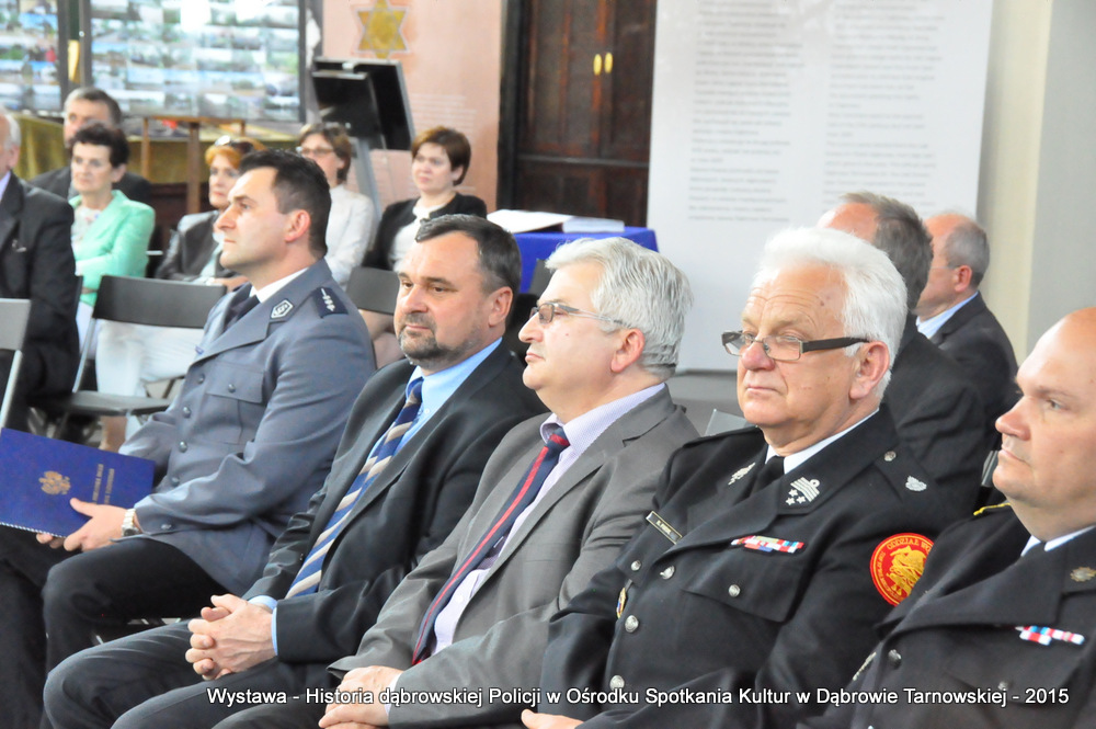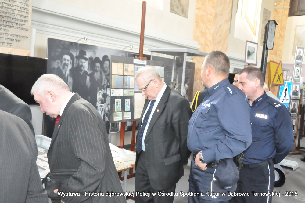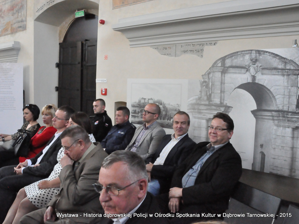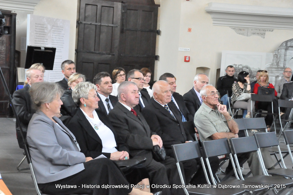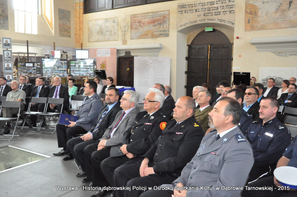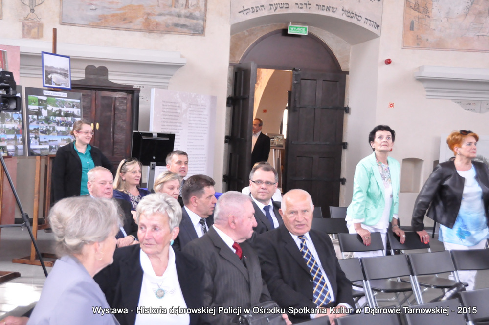 Z zaproszonych gości w otwarciu wystawy uczestniczyli m.in: Krzysztof Kaczmarski – Burmistrz Dąbrowy Tarnowskiej, Marek Kopia – Wicestarosta Dąbrowski, Jacek Sarat – Przewodniczący Rady Miejskiej w Dąbrowie Tarnowskiej wraz z radnymi, Barbara Gawle – Wiceprzewodnicząca Rady Miejskiej, Janusz Plata – Sekretarz Gminy Olesno, Krzysztof Kolarczyk – p.o. Komendanta Powiatowego Państwowej Straży Pożarnej, Ryszard Pikul – Prezes Zarządu Powiatowego Związku OSP, Stanisław Drabik - Komendant Powiatowy Policji w stanie spoczynku, Waldemar Siwiec - Komendant Powiatowy Policji w stanie spoczynku, Józef Czapla - Komendant Powiatowy Policji w stanie spoczynku, Marian Gajda – Dyrektor ZOSiP w Dąbrowie Tarnowskiej, Iwona Wrzoskiewicz-Słonka – Dyrektor Gimnazjum nr 2 w Dąbrowie Tarnowskiej, Jan Kiljan – Dyrektor ZSP nr 2 w Dąbrowie Tarnowskiej, Jarosław Boryczka - Dyrektor ZSP w Brniu, Anna Fido – Dyrektor Szkoły Podstawowej nr 2 w Dąbrowie Tarnowskiej, Maria Kazek – Dyrektor Przedszkola nr 1 w Dąbrowie Tarnowskiej, Stanisław Początek – Dyrektor Powiatowego Urzędu Pracy, Anna Witowska – radna Rady Powiatu, por. Józef Stalmach – Dowódca Jednostki Strzeleckiej, Marceli Bochenek – Dyrektor Wydziału Historii (Muzeum Drogownictwa w Szczucinie), Piotr Zając – Prezes klubu MLKS „Dąbrovia”, Krystyna Guzik – Prezes Uniwersytetu Trzeciego Wieku przy DDK, Marian Łączyński – Prezes oddziału Związku Emerytów, Rencistów i Inwalidów w Dąbrowie Tarnowskiej, Mieczysław Śliski – bratanek przedwojennego policjanta Zygmunta Śliskiego, Józefa Owsiany - żona milicjanta Kazimierza Owsianego i wielu innych znamienitych gości. Po powitaniu przybyłych gości przez Pawła Chojnowskiego - Dyrektora Dąbrowskiego Domu Kultury został wygłoszony przez Komendanta Powiatowego Policji w Dąbrowie Tarnowskiej mł. insp. Andrzeja Kupca referat okolicznościowy na temat historii dąbrowskiej Policji, ich służby na przełomie ostatnich 95 lat. Należy dodać, że prace mające na celu zebranie materiałów na wystawę Komendant zainicjował już w 2014 roku, angażując do realizacji tego dzieła Panią Bogusławę Bociek i st. asp. Krzysztofa Lechowicz. W swoich wystąpieniach Burmistrz Krzysztof Kaczmarski i Wicestarosta Marek Kopia podkreślali rolę Policji w życiu społecznym, zaznaczając, że prezentowana wystawa stanowi istotny wkład w szerzenie kultury oraz promocję Powiśla Dąbrowskiego. We współpracy m.in. z Archiwum Narodowym w Krakowie, Urzędem Miejskim w Dąbrowie Tarnowskiej, Zespołem Historii Drogownictwa GDDKiA w Szczucinie, Kurierem Dąbrowskim oraz dzięki życzliwości osób prywatnych, w tym emerytów policyjnych udało się zebrać wiele fotografii i dokumentów przedstawiających służbę dąbrowskich policjantów w ciągu ostatniego wieku. Ponadto przybliżono sylwetki policjantów powiązanych z ziemią Powiśla Dąbrowskiego oraz historią formacji m.in. gen. Eugeniusza Dąbrowieckiego, Zygmunta Śliskiego, Tadeusza Krasnodębskiego czy Kazimierza Owsianego. Wystawa będzie prezentowana w synagodze do 3 czerwca 2015 roku. Serdecznie zapraszamy wszystkich mieszkańców do zwiedzania wystawy w godzinach otwarcia Ośrodka Spotkania Kultur. Bliższe informacje można uzyskać pod nr tel. 14 657 00 09 lub na stronie internetowej http://www.oskdabrowa.pl.