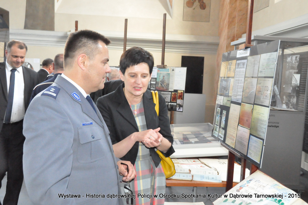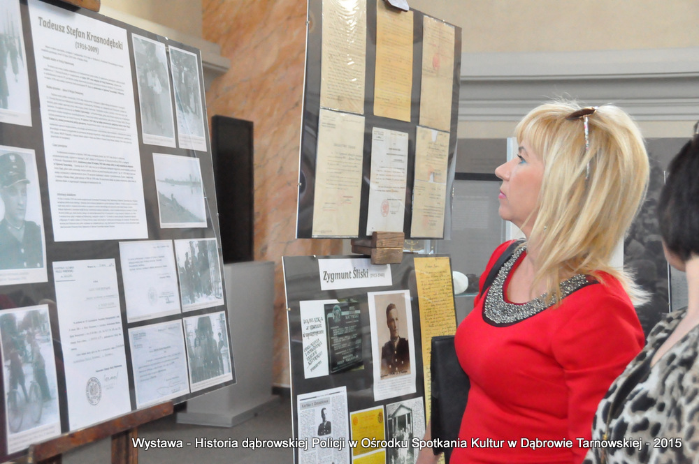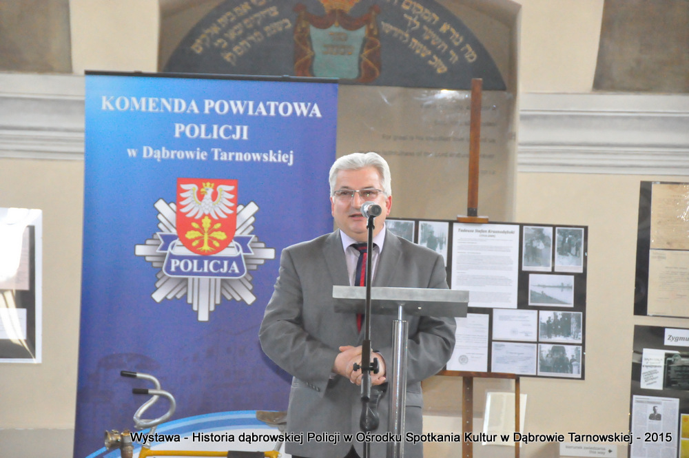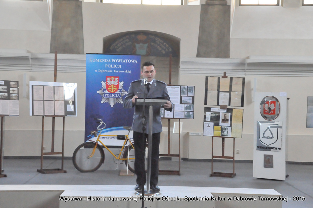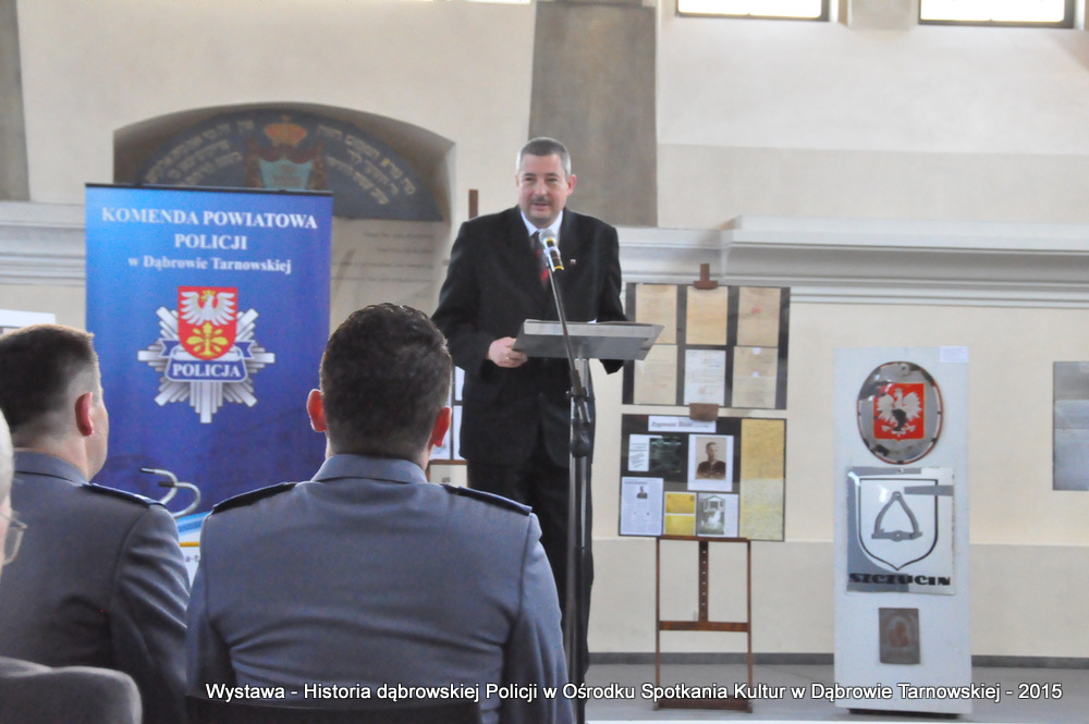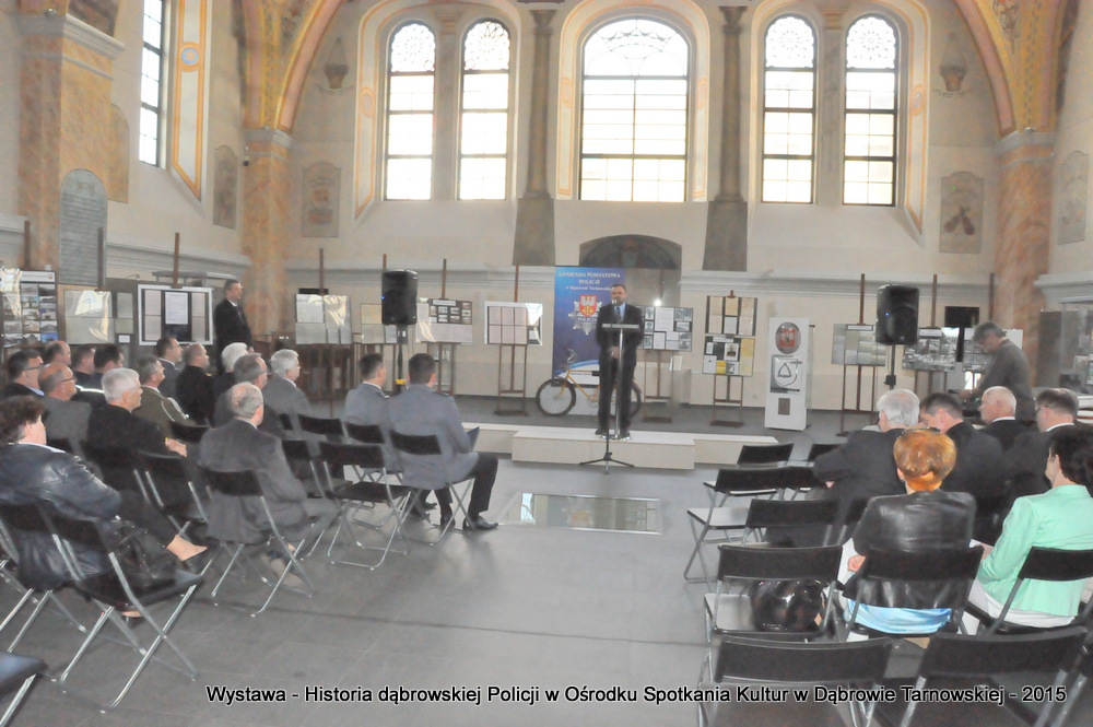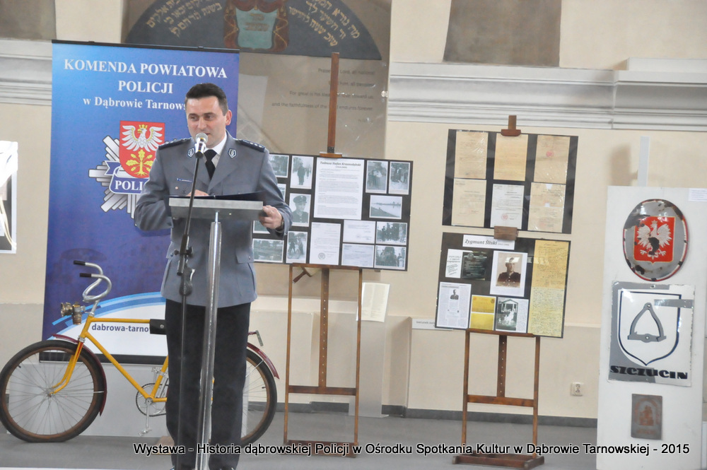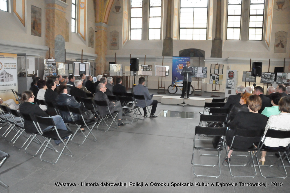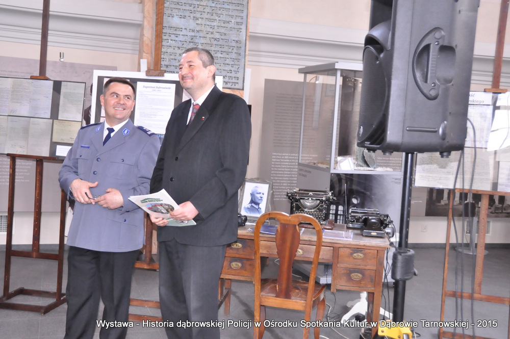 Z zaproszonych gości w otwarciu wystawy uczestniczyli m.in: Krzysztof Kaczmarski – Burmistrz Dąbrowy Tarnowskiej, Marek Kopia – Wicestarosta Dąbrowski, Jacek Sarat – Przewodniczący Rady Miejskiej w Dąbrowie Tarnowskiej wraz z radnymi, Barbara Gawle – Wiceprzewodnicząca Rady Miejskiej, Janusz Plata – Sekretarz Gminy Olesno, Krzysztof Kolarczyk – p.o. Komendanta Powiatowego Państwowej Straży Pożarnej, Ryszard Pikul – Prezes Zarządu Powiatowego Związku OSP, Stanisław Drabik - Komendant Powiatowy Policji w stanie spoczynku, Waldemar Siwiec - Komendant Powiatowy Policji w stanie spoczynku, Józef Czapla - Komendant Powiatowy Policji w stanie spoczynku, Marian Gajda – Dyrektor ZOSiP w Dąbrowie Tarnowskiej, Iwona Wrzoskiewicz-Słonka – Dyrektor Gimnazjum nr 2 w Dąbrowie Tarnowskiej, Jan Kiljan – Dyrektor ZSP nr 2 w Dąbrowie Tarnowskiej, Jarosław Boryczka - Dyrektor ZSP w Brniu, Anna Fido – Dyrektor Szkoły Podstawowej nr 2 w Dąbrowie Tarnowskiej, Maria Kazek – Dyrektor Przedszkola nr 1 w Dąbrowie Tarnowskiej, Stanisław Początek – Dyrektor Powiatowego Urzędu Pracy, Anna Witowska – radna Rady Powiatu, por. Józef Stalmach – Dowódca Jednostki Strzeleckiej, Marceli Bochenek – Dyrektor Wydziału Historii (Muzeum Drogownictwa w Szczucinie), Piotr Zając – Prezes klubu MLKS „Dąbrovia”, Krystyna Guzik – Prezes Uniwersytetu Trzeciego Wieku przy DDK, Marian Łączyński – Prezes oddziału Związku Emerytów, Rencistów i Inwalidów w Dąbrowie Tarnowskiej, Mieczysław Śliski – bratanek przedwojennego policjanta Zygmunta Śliskiego, Józefa Owsiany - żona milicjanta Kazimierza Owsianego i wielu innych znamienitych gości. Po powitaniu przybyłych gości przez Pawła Chojnowskiego - Dyrektora Dąbrowskiego Domu Kultury został wygłoszony przez Komendanta Powiatowego Policji w Dąbrowie Tarnowskiej mł. insp. Andrzeja Kupca referat okolicznościowy na temat historii dąbrowskiej Policji, ich służby na przełomie ostatnich 95 lat. Należy dodać, że prace mające na celu zebranie materiałów na wystawę Komendant zainicjował już w 2014 roku, angażując do realizacji tego dzieła Panią Bogusławę Bociek i st. asp. Krzysztofa Lechowicz. W swoich wystąpieniach Burmistrz Krzysztof Kaczmarski i Wicestarosta Marek Kopia podkreślali rolę Policji w życiu społecznym, zaznaczając, że prezentowana wystawa stanowi istotny wkład w szerzenie kultury oraz promocję Powiśla Dąbrowskiego. We współpracy m.in. z Archiwum Narodowym w Krakowie, Urzędem Miejskim w Dąbrowie Tarnowskiej, Zespołem Historii Drogownictwa GDDKiA w Szczucinie, Kurierem Dąbrowskim oraz dzięki życzliwości osób prywatnych, w tym emerytów policyjnych udało się zebrać wiele fotografii i dokumentów przedstawiających służbę dąbrowskich policjantów w ciągu ostatniego wieku. Ponadto przybliżono sylwetki policjantów powiązanych z ziemią Powiśla Dąbrowskiego oraz historią formacji m.in. gen. Eugeniusza Dąbrowieckiego, Zygmunta Śliskiego, Tadeusza Krasnodębskiego czy Kazimierza Owsianego. Wystawa będzie prezentowana w synagodze do 3 czerwca 2015 roku. Serdecznie zapraszamy wszystkich mieszkańców do zwiedzania wystawy w godzinach otwarcia Ośrodka Spotkania Kultur. Bliższe informacje można uzyskać pod nr tel. 14 657 00 09 lub na stronie internetowej http://www.oskdabrowa.pl.