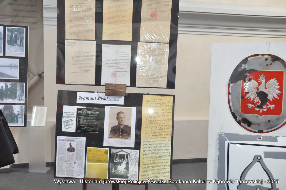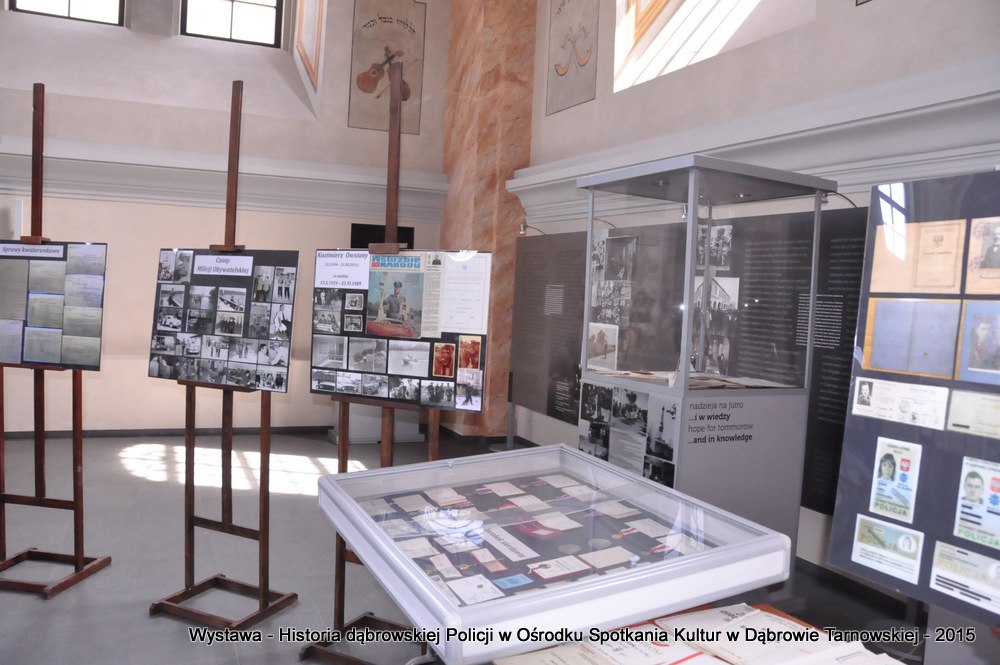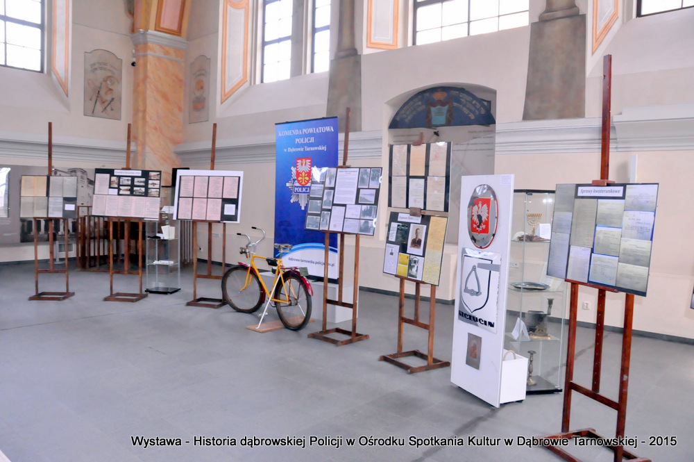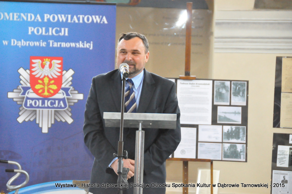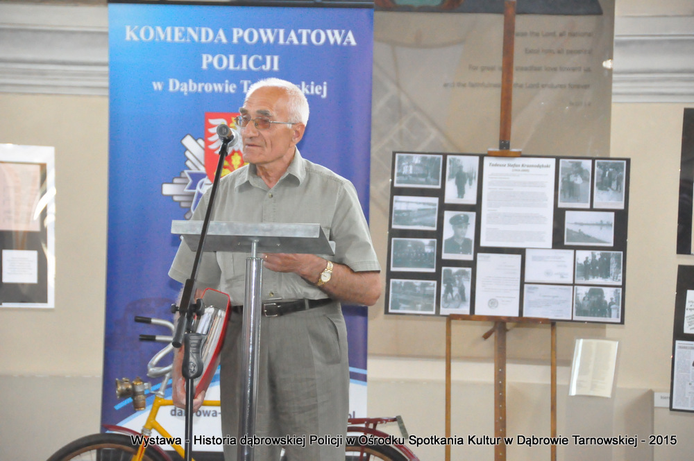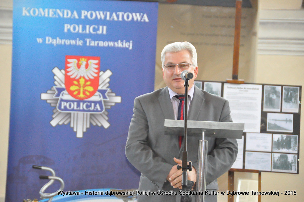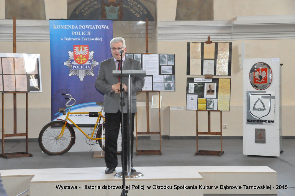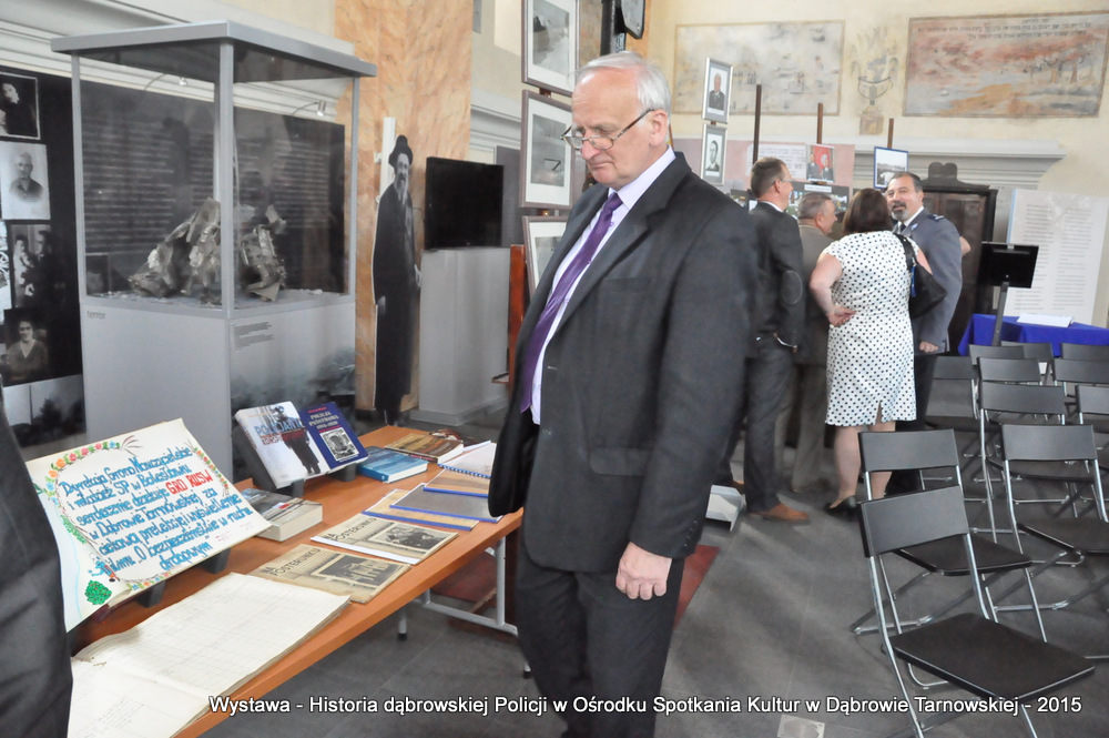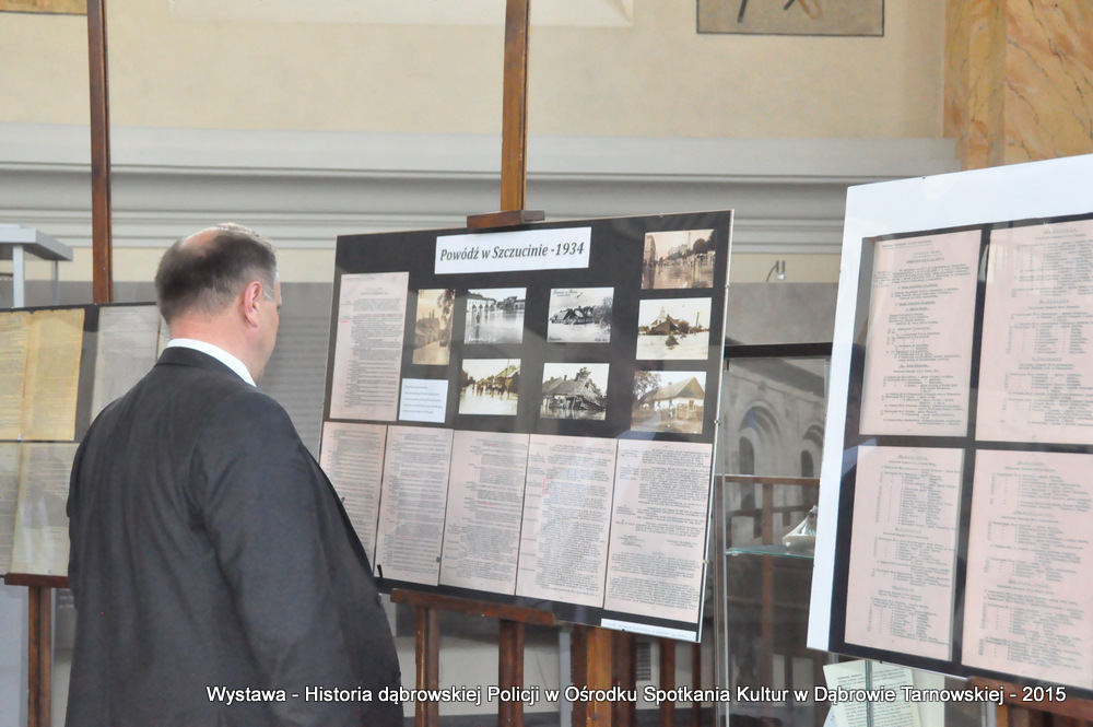 Z zaproszonych gości w otwarciu wystawy uczestniczyli m.in: Krzysztof Kaczmarski – Burmistrz Dąbrowy Tarnowskiej, Marek Kopia – Wicestarosta Dąbrowski, Jacek Sarat – Przewodniczący Rady Miejskiej w Dąbrowie Tarnowskiej wraz z radnymi, Barbara Gawle – Wiceprzewodnicząca Rady Miejskiej, Janusz Plata – Sekretarz Gminy Olesno, Krzysztof Kolarczyk – p.o. Komendanta Powiatowego Państwowej Straży Pożarnej, Ryszard Pikul – Prezes Zarządu Powiatowego Związku OSP, Stanisław Drabik - Komendant Powiatowy Policji w stanie spoczynku, Waldemar Siwiec - Komendant Powiatowy Policji w stanie spoczynku, Józef Czapla - Komendant Powiatowy Policji w stanie spoczynku, Marian Gajda – Dyrektor ZOSiP w Dąbrowie Tarnowskiej, Iwona Wrzoskiewicz-Słonka – Dyrektor Gimnazjum nr 2 w Dąbrowie Tarnowskiej, Jan Kiljan – Dyrektor ZSP nr 2 w Dąbrowie Tarnowskiej, Jarosław Boryczka - Dyrektor ZSP w Brniu, Anna Fido – Dyrektor Szkoły Podstawowej nr 2 w Dąbrowie Tarnowskiej, Maria Kazek – Dyrektor Przedszkola nr 1 w Dąbrowie Tarnowskiej, Stanisław Początek – Dyrektor Powiatowego Urzędu Pracy, Anna Witowska – radna Rady Powiatu, por. Józef Stalmach – Dowódca Jednostki Strzeleckiej, Marceli Bochenek – Dyrektor Wydziału Historii (Muzeum Drogownictwa w Szczucinie), Piotr Zając – Prezes klubu MLKS „Dąbrovia”, Krystyna Guzik – Prezes Uniwersytetu Trzeciego Wieku przy DDK, Marian Łączyński – Prezes oddziału Związku Emerytów, Rencistów i Inwalidów w Dąbrowie Tarnowskiej, Mieczysław Śliski – bratanek przedwojennego policjanta Zygmunta Śliskiego, Józefa Owsiany - żona milicjanta Kazimierza Owsianego i wielu innych znamienitych gości. Po powitaniu przybyłych gości przez Pawła Chojnowskiego - Dyrektora Dąbrowskiego Domu Kultury został wygłoszony przez Komendanta Powiatowego Policji w Dąbrowie Tarnowskiej mł. insp. Andrzeja Kupca referat okolicznościowy na temat historii dąbrowskiej Policji, ich służby na przełomie ostatnich 95 lat. Należy dodać, że prace mające na celu zebranie materiałów na wystawę Komendant zainicjował już w 2014 roku, angażując do realizacji tego dzieła Panią Bogusławę Bociek i st. asp. Krzysztofa Lechowicz. W swoich wystąpieniach Burmistrz Krzysztof Kaczmarski i Wicestarosta Marek Kopia podkreślali rolę Policji w życiu społecznym, zaznaczając, że prezentowana wystawa stanowi istotny wkład w szerzenie kultury oraz promocję Powiśla Dąbrowskiego. We współpracy m.in. z Archiwum Narodowym w Krakowie, Urzędem Miejskim w Dąbrowie Tarnowskiej, Zespołem Historii Drogownictwa GDDKiA w Szczucinie, Kurierem Dąbrowskim oraz dzięki życzliwości osób prywatnych, w tym emerytów policyjnych udało się zebrać wiele fotografii i dokumentów przedstawiających służbę dąbrowskich policjantów w ciągu ostatniego wieku. Ponadto przybliżono sylwetki policjantów powiązanych z ziemią Powiśla Dąbrowskiego oraz historią formacji m.in. gen. Eugeniusza Dąbrowieckiego, Zygmunta Śliskiego, Tadeusza Krasnodębskiego czy Kazimierza Owsianego. Wystawa będzie prezentowana w synagodze do 3 czerwca 2015 roku. Serdecznie zapraszamy wszystkich mieszkańców do zwiedzania wystawy w godzinach otwarcia Ośrodka Spotkania Kultur. Bliższe informacje można uzyskać pod nr tel. 14 657 00 09 lub na stronie internetowej http://www.oskdabrowa.pl.