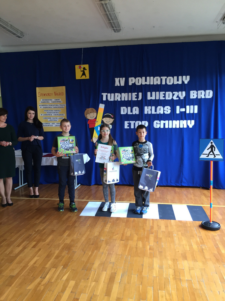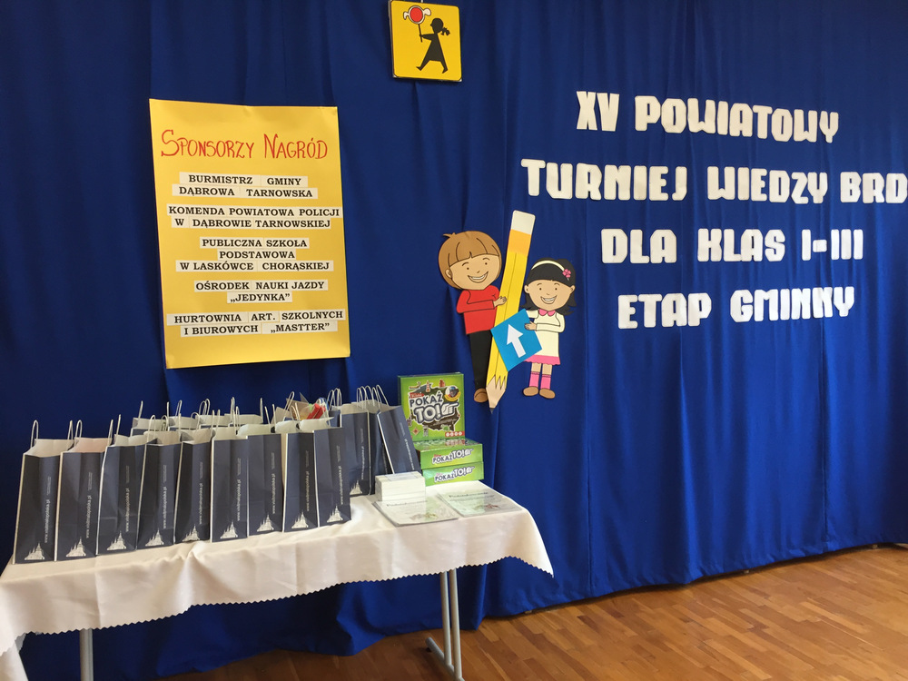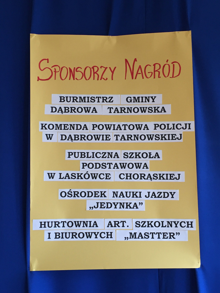 Wszyscy uczestnicy konkursu otrzymali pamiątkowe dyplomy oraz wspaniałe nagrody rzeczowe, które zostały ufundowane przez : - Burmistrza Gminy Dąbrowa Tarnowska - Komendę Powiatową Policji w Dąbrowie Tarnowskiej, - PSP w Laskówce Chorąskiej - Ośrodek Nauki Jazdy „Jedynka” w Dąbrowie Tarnowskiej - Hurtownię art. szkolnych i biurowych MASTTER - Jednego z rodziców z PSP w Laskówce Chorąskiej