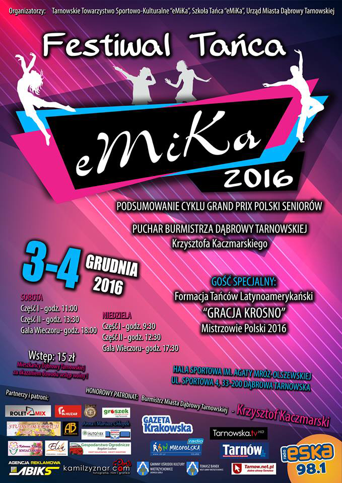 W pierwszy weekend grudnia, w dniach 3-4.12 w Dąbrowie Tarnowskiej na Hali Sportowej im. Agaty Mróz - Olszewskiej odbędzie się XX Festiwal Tańca Towarzyskiego „eMiKa2016”. W pierwszy dzień odbędzie się podsumowanie cyklu turnieju rangi Grand Prix Polski Seniorów, tj. dla tancerzy w wieku 29 +.  Już dzisiaj zapraszamy na wspaniałą imprezę turnieju i pokazów tańca. Organizatorami XX Festiwalu Tańca Towarzyskiego,,eMiKa2016'' są: Tarnowskie Towarzystwo Sportowo-Kulturalne eMiKa, Szkoła Tańca „eMiKa” Małgorzaty Pletty-Zyznar, Urząd Miejski w Dąbrowie Tarnowskiej. Patronat honorowy nad tym wydarzeniem objął: Krzysztof Kaczmarski - Burmistrz Dąbrowy Tarnowskiej. Dla Mieszkańców z naszego terenu wstęp wolny! Zapraszamy