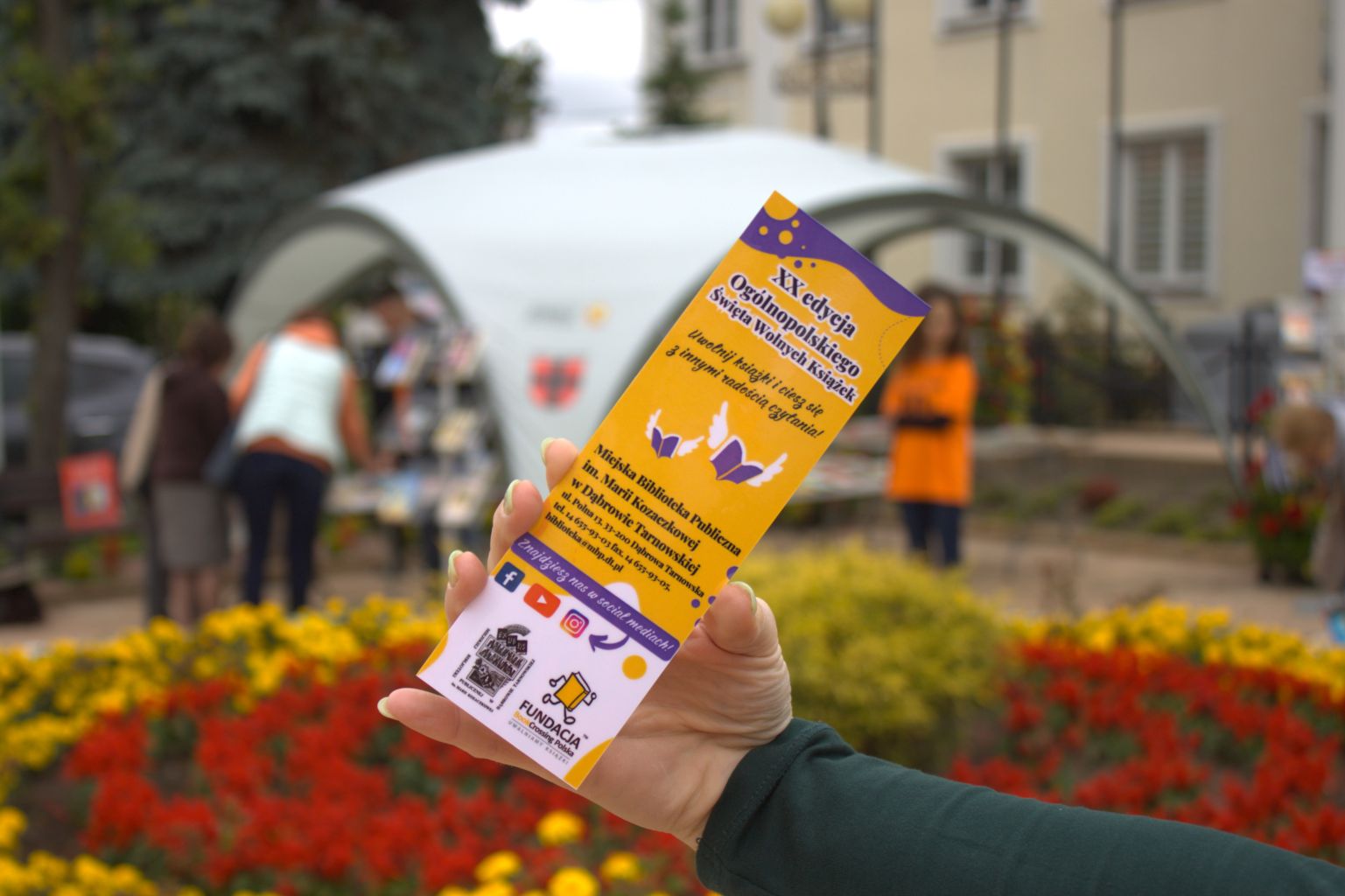 Miejska Biblioteka Publiczna im. Marii Kozaczkowej w Dąbrowie Tarnowskiej włączyła się w obchody XX edycji Ogólnopolskiego Święta Wolnych Książek, które było celebrowane 13 czerwca br. We wtorek na placu przed Urzędem Miejskim w Dąbrowie Tarnowskiej, w godzinach od 11:00 do 14:00, bibliotekarze wspólnie z wolontariuszami założyli punkt bookcrossingowy. Na stolikach, regałach i przy klombie z kwiatami wyeksponowane zostały książki, które mieszkańcy oraz przechodzący przez dąbrowski rynek mogli ze sobą zabrać. Zaprezentowana cała gama publikacji poruszających różne tematy spotkała się z pozytywnym odbiorem. Plenerowy bookcrossing odwiedziły zarówno dzieci, młodzież szkolna, jak i dorośli. Każdy mógł znaleźć coś dla siebie i nikt nie odszedł bez książki! Z tej okazji zostały także zaprojektowane przez bibliotekarki pamiątkowe zakładki do książek, które były rozdawane odwiedzającym stoisko.