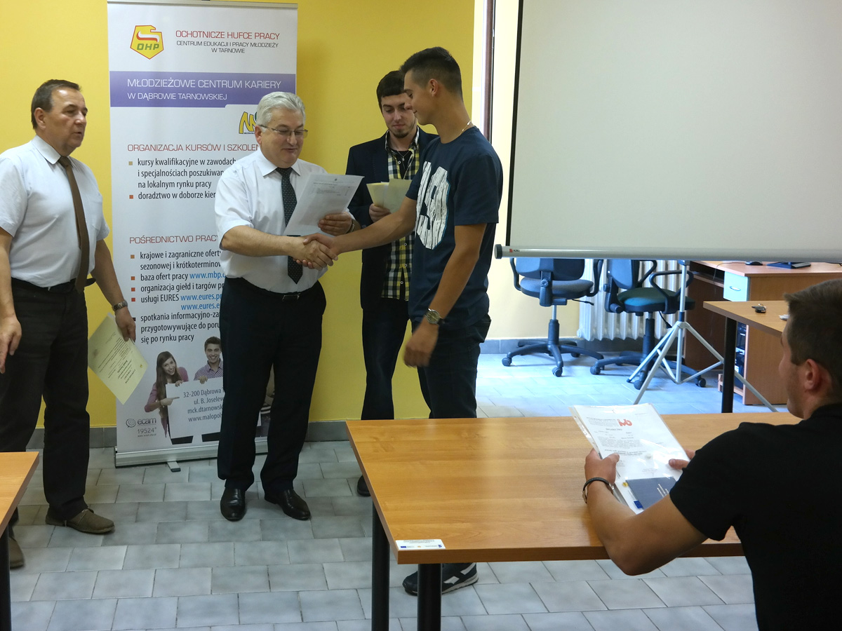 W dniu 6 lipca 2017 r. w Młodzieżowym Centrum Kariery w Dąbrowie Tarnowskiej odbyło się zakończenie kursów zawodowych realizowanych w II kwartale br. Był to odpowiedni moment do podsumowania półrocznej działalności MCK. W przedsięwzięciu tym wzięli udział Burmistrz Dąbrowy Tarnowskiej - Krzysztof Kaczmarski oraz Dyrektor  Centrum Edukacji i Pracy Młodzieży OHP w Tarnowie - Adam Potempa, którzy wręczyli młodzieży zaświadczenia potwierdzające ukończenie kursów oraz dokumenty uprawniające do obsługi koparko-ładowarek i wózków jezdniowych. Złożyli również uczestnikom kursów gratulacje oraz życzyli sukcesów w znalezieniu swego miejsca na rynku pracy.