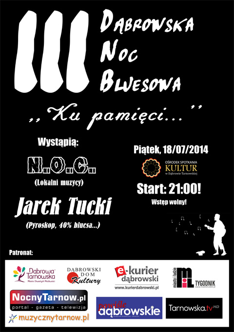 Informacje dodatkowe: Noc Bluesowa będzie przeprowadzona jako impreza towarzysząca Dniom Dąbrowy Tarnowskiej 2014. Główni organizatorzy to: Dąbrowski Dom Kultury oraz Sebastian Lechowicz – inicjator przedsięwzięcia, lider składu lokalnych muzyków. Honorowy patronat nad przebiegiem wydarzenia obejmuje Miasto i Gmina Dąbrowa Tarnowska.