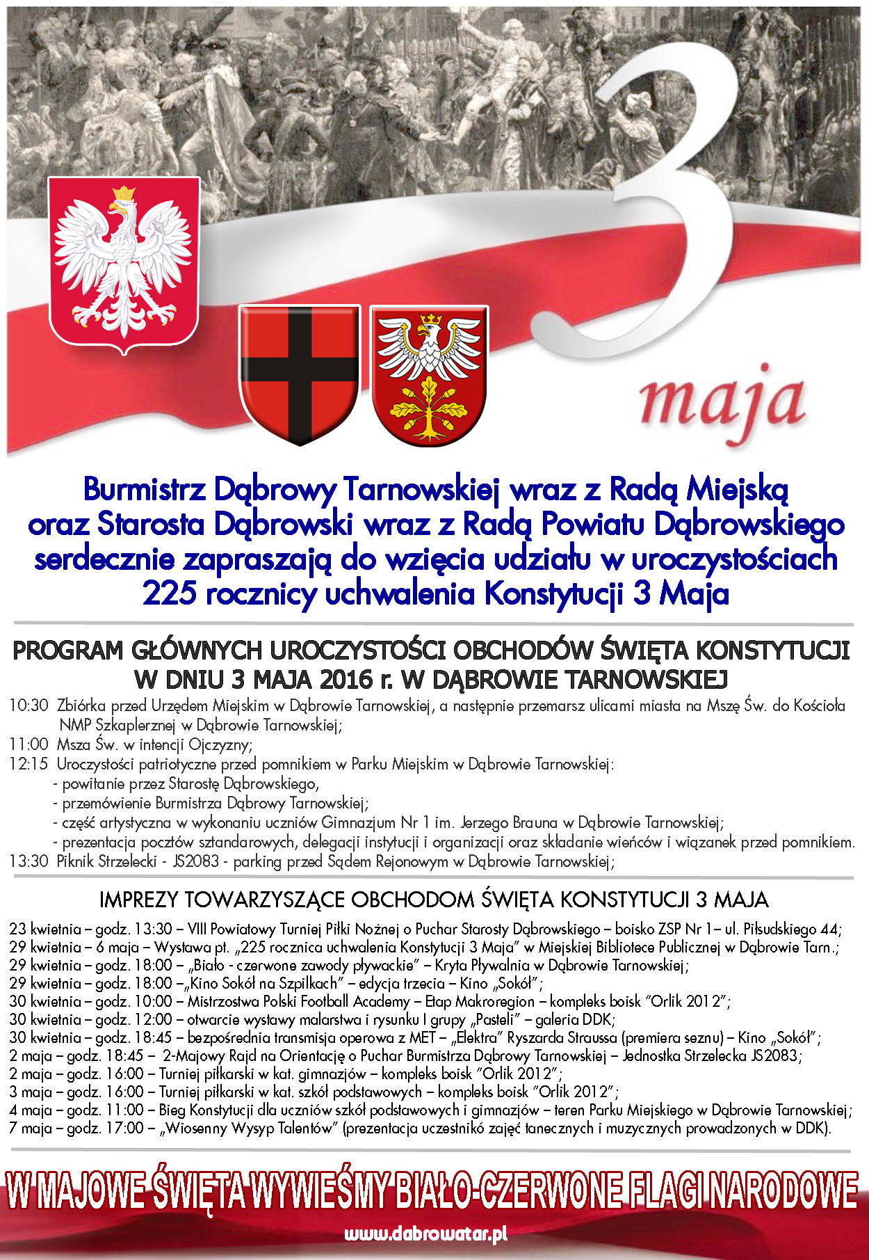 Burmistrz Dąbrowy Tarnowskiej wraz Radą Miejską oraz Starosta Dąbrowski wraz z Radą Powiatu Dąbrowskiego serdecznie zapraszają wszystkich, a szczególnie Mieszkańców Miasta Dąbrowa Tarnowska, oraz całego Powiatu Dąbrowskiego, jak również miłych Gości do wzięcia udziału w uroczystościach obchodów 225 Rocznicy Uchwalenia Konstytucji 3 Maja. W programie obchodów oprócz patriortyczno – religijnych uroczystości głównych przewidziano wiele atrakcyjnych imprez towarzyszących, zarówno o charakterze sportowym jak i kulturalnym, spośród których każdy będzie mógł znaleźć coś dla siebie.