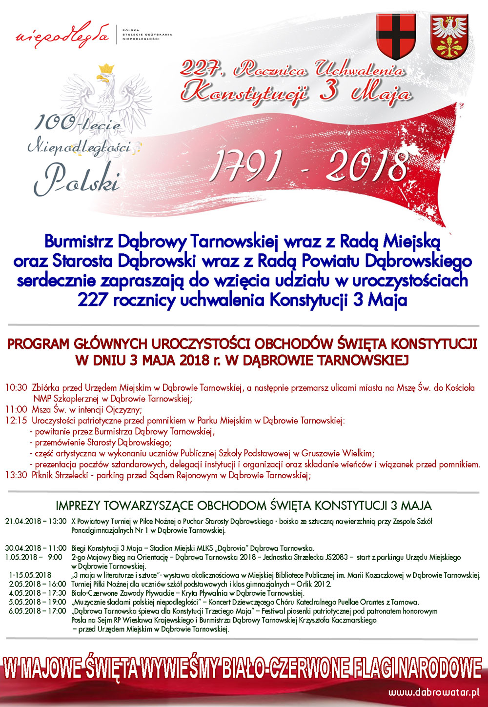 W Roku 100-lecia Niepodległości Polski, Burmistrz Dąbrowy Tarnowskiej wraz z Radą Miejską oraz Starosta Dąbrowski wraz z Radą Powiatu Dąbrowskiego serdecznie zapraszają wszystkich, a szczególnie Mieszkańców Miasta Dąbrowa Tarnowska, oraz całego Powiatu Dąbrowskiego, jak również miłych Gości do wzięcia udziału w uroczystościach obchodów 227 Rocznicy Uchwalenia Konstytucji 3 Maja. W programie obchodów oprócz patriotyczno – religijnych uroczystości głównych przewidziano wiele atrakcyjnych imprez towarzyszących, zarówno o charakterze sportowym jak i kulturalnym, spośród których każdy będzie mógł znaleźć coś dla siebie.