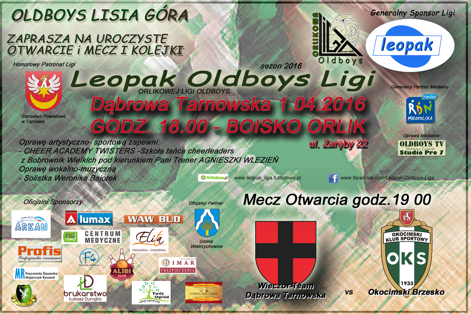 plakat owarcie 2016 poziom Zapraszamy na start II edycji Leopak Oldboys Ligi meczem Wieczor Team Dąbrowa Tarnowska – Okocimski Brzesko