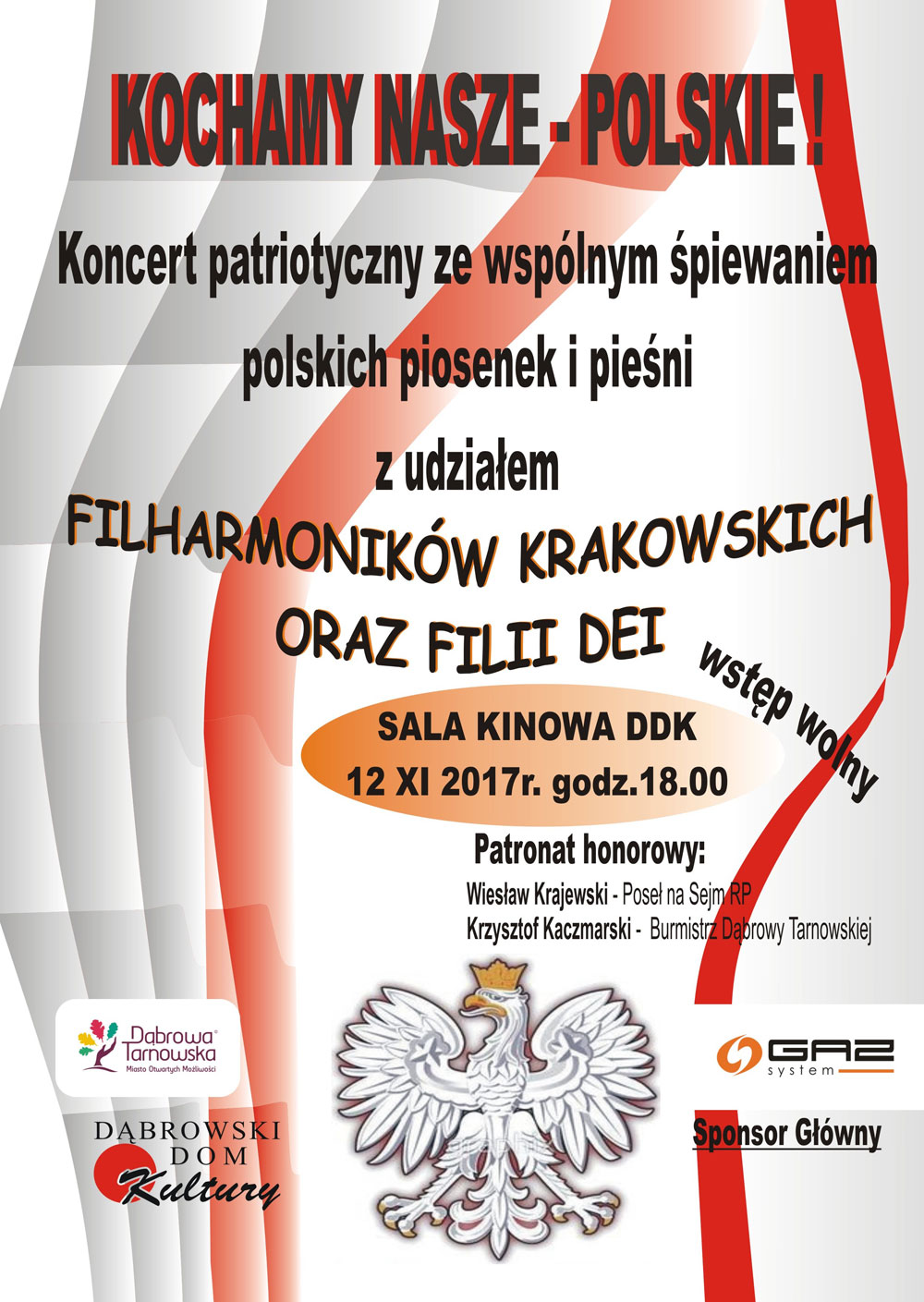 Po pionierskim śpiewaniu mieszkańców Dąbrowy Tarnowskiej dla Konstytucji Trzeciego Maja wiosną b.r. Dąbrowski Dom Kultury chce iść za ciosem w kierunku rozśpiewania Dąbrowy Tarnowskiej w kontekście świąt narodowych i proponuje bardzo atrakcyjne widowisko p.n. „Kochamy polskie – nasze!”. Odbędzie się ono w sali kinowej DDK w niedzielę 12 listopada o godz. 18:00. Złożą się nań: zapowiadający się niezwykle interesująco koncert Filharmoników Krakowskich (męski zespół wokalny, instrumentaliści pod batutą Marcina Wróbla, soliści: sopran, tenor, bas i recytator Piotr Piecha z Teatru Ludowego w Nowej Hucie) oraz wspólne śpiewanie wielkich polskich przebojów, prowadzone przez zespół dąbrowski „Filii Dei” związany z Parafią Rzymsko-Katolicką oraz Strzelca Tomasza Żygułę.