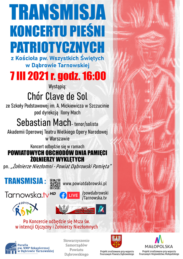 Stowarzyszenie Samorządów Powiatu Dąbrowskiego serdecznie zaprasza do oglądania transmisji Koncertu pieśni patriotycznych, organizowanego w ramach Powiatowych Obchodów Dnia Pamięci Żołnierzy Wyklętych pn. „Żołnierze Niezłomni – Powiat Dąbrowski Pamięta”, który odbędzie się w niedzielę 7 marca 2021 roku o godz. 1600 w Kościele pw. Wszystkich Świętych w Dąbrowie Tarnowskiej. Koncert transmitowany będzie na żywo na stronie internetowej Powiatu Dąbrowskiego tj. www.powiatdabrowski.pl oraz przez RDN Małopolska, Telewizję Tarnowska.tv i Klub Gazety Polskiej Dąbrowa Tarnowska.