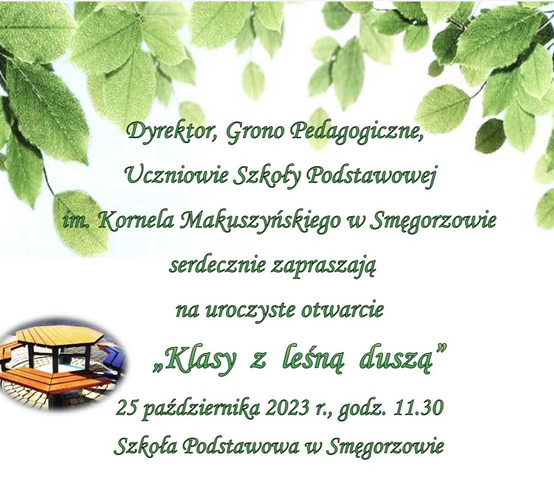 Szkoła Podstawowa im. Kornela Makuszyńskiego w Smęgorzowie serdecznie zaprasza na uroczyste otwarcie „Klasy z leśną duszą”, która powstała przy wsparciu finansowym Lasów Państwowych.