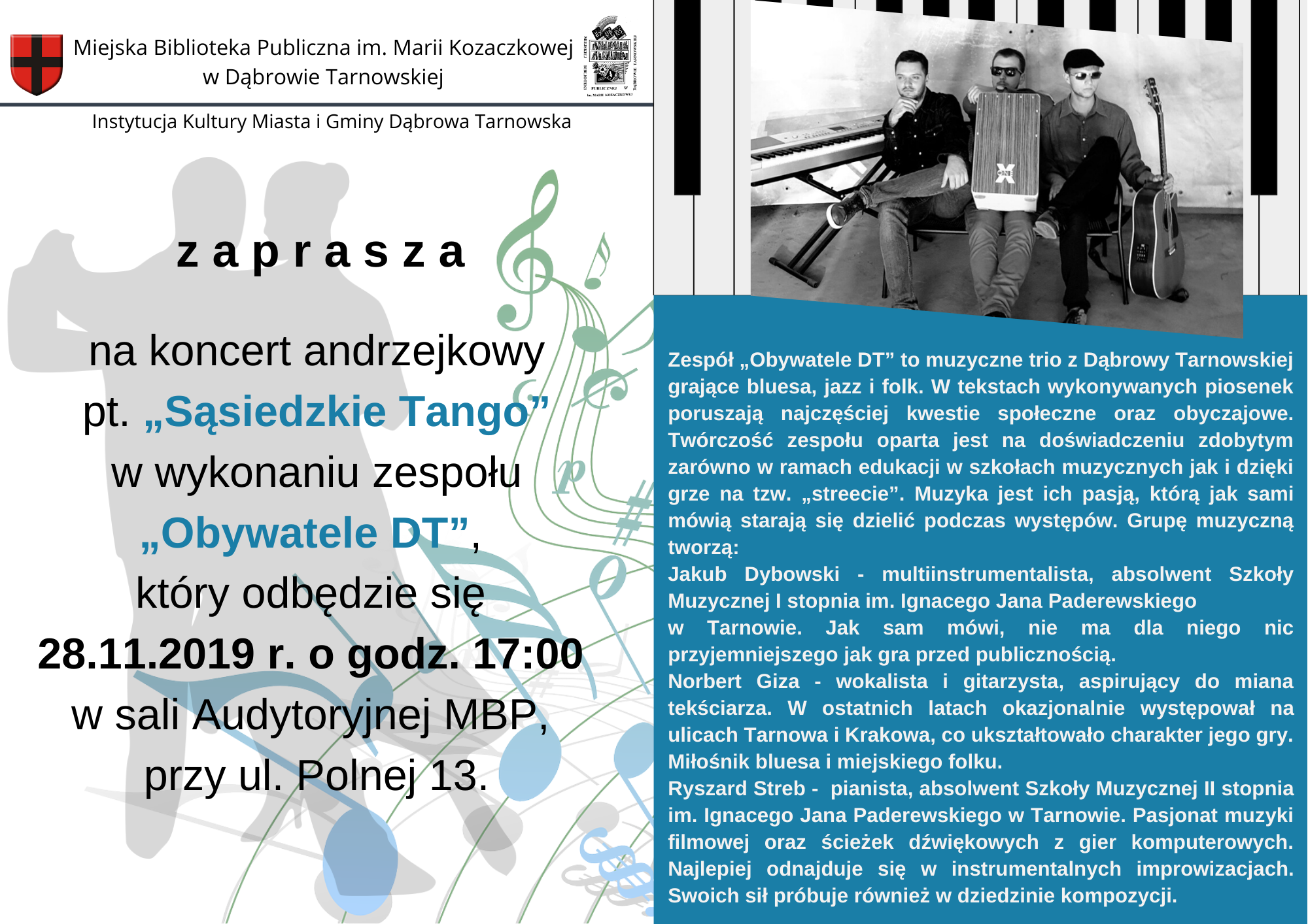 Miejska Biblioteka Publiczna im. Marii Kozaczkowej w Dąbrowie Tarnowskiej zaprasza w czwartek 28 listopada br. o godz. 17:00 na koncert andrzejkowy pt. „Sąsiedzkie Tango” w wykonaniu zespołu „Obywatele DT”. W skład zespołu wchodzą młodzi muzycy związani z Dąbrową Tarnowską i Tarnowem: Jakub Dybowski, Norbert Giza i Ryszard Streb. Zagrają w Sali Audytoryjnej MBP (I piętro) przy ul. Polnej 13.