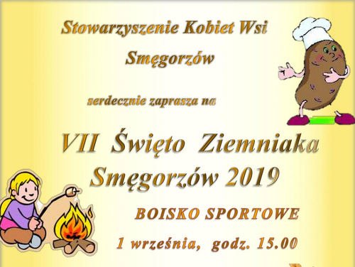 Stowarzyszenie Kobiet Wsi Smęgorzów, Rada Sołecka w Smęgorzowie serdecznie zapraszają wraz z Urzędem Miejskim w Dąbrowie Tarnowskiej na VII Święto Ziemniaka. Impreza ta, która w ostatnich latach na stałe wpisała się do kalendarza wydarzeń gminnych, w tym roku odbędzie się 1 września br. na boisku sportowym w Smęgorzowie. W bogatym programie wydarzenia przewidziano występy artystyczne oraz konkursy ziemniaczane. Nie zabraknie pokazów strażackich i atrakcji dla dzieci, w tym dmuchanego miasteczka. Jednym z oczekiwanych w Święcie Ziemniaka będzie oczywiście motyw kulinarny, a degustacja potraw na bazie ziemniaka będzie towarzyszyła uczestnikom do wyczerpania przygotowanych zapasów. Rozpoczęcie ziemniaczanego święta zaplanowano na 15:00.