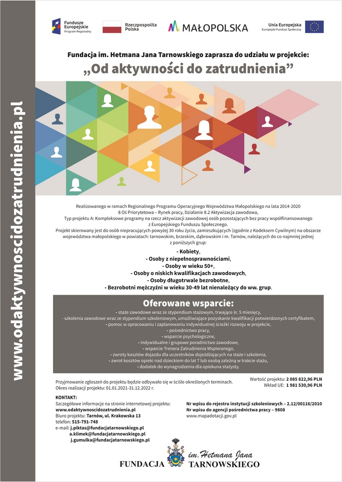 Fundacja im. Hetmana Jana Tarnowskiego zaprasza do udziału w projekcie „Od aktywności do zatrudnienia” współfinansowanego w ramach Regionalnego Programu Operacyjnego Województwa Małopolskiego na lata 2014-2020, Oś Priorytetowa 8 Rynek Pracy, Działanie 8.2 Aktywizacja zawodowa, Typ projektu A: kompleksowe programy na rzecz aktywizacji zawodowej osób pozostających bez pracy. Projekt skierowany jest do osób niepracujących powyżej 30 roku życia, zamieszkujących (zgodnie z Kodeksem Cywilnym) na obszarze województwa małopolskiego w powiatach: tarnowskim, brzeskim, dąbrowskim i m. Tarnów.