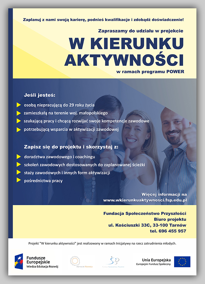 Fundacja Społeczeństwo Przyszłości w partnerstwie z Warsztat Rozwoju Agata Olszewska-Sarapata zapraszają do projektu "W kierunku aktywności" w ramach programu POWER, realizowanego z wykorzystaniem funduszy unijnych.