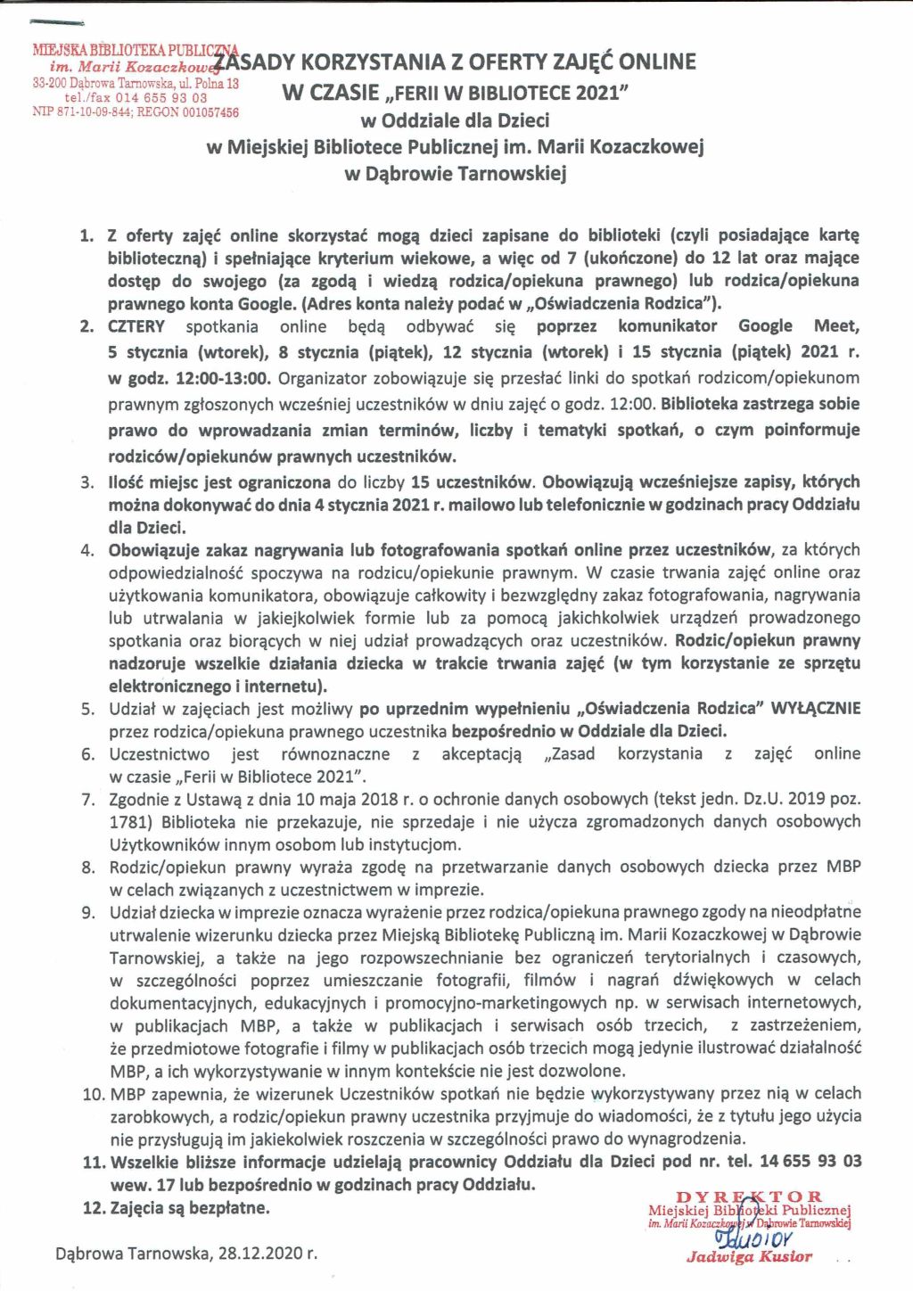 Miejska Biblioteka Publiczna im. Marii Kozaczkowej w Dąbrowie Tarnowskiej Oddział dla Dzieci serdecznie zaprasza na bezpłatne zajęcia online pod hasłem „Zmyślanie na ekranie” w ramach „Ferii w Bibliotece 2021”. Zimowe, książkowe (i nie tylko) spotkania odbędą się w przestrzeni wirtualnej dla chętnych młodych użytkowników biblioteki w wieku od 7 do 12 lat. Konieczne jest wypełnienie zgody przez rodzica/opiekuna prawnego uczestnika oraz zapoznanie się z „Zasadami korzystania z oferty zajęć online”, które dostępne są na stronie biblioteki: www.mbp.dt.pl lub bezpośrednio w Oddziale dla Dzieci w godzinach pracy. Obowiązują wcześniejsze zapisy!