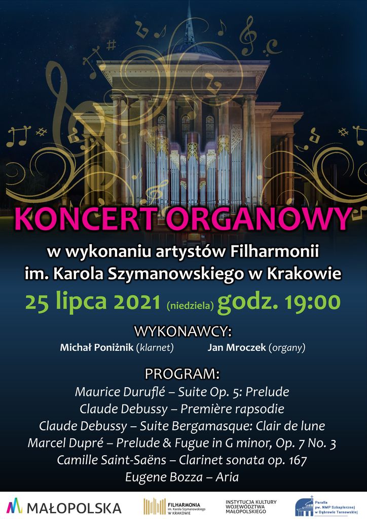 Parafia pw. NMP Szkaplerznej w Dąbrowie Tarnowskiej serdecznie zaprasza na koncert w wykonaniu artystów Filharmonii im. Karola Szymanowskiego w Krakowie, który odbędzie się w niedzielę 25 lipca 2021 roku o godz. 19:00 w kościele parafialnych pw. NMP Szkaplerznej w Dąbrowie Tarnowskiej. Koncert będzie transmitowany przez Radio RDN Małopolska. Wydarzenie artystyczne realizowane jest w ramach projektu „Muzyka religijna – cykl koncertów w Kościele Parafialnym w Dąbrowie Tarnowskiej” przy wsparciu finansowym Województwa Małopolskiego.