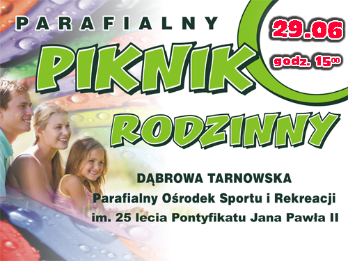 W najbliższą niedzielę 29 czerwca br. od godz. 15:00 na terenie Parafialnego Ośrodka Sportu im. 25 lecia Pontyfikatu Jana Pawła II w Dąbrowie Tarnowskiej, odbędzie się doroczny Parafialny Piknik Rodzinny. Zwyczajem lat ubiegłych, będzie to wspólna rodzinna zabawa pełna różnych atrakcji: konkursy, rozgrywki drużynowe, występy artystyczne. W czasie Pikniku będą zabawy dla dzieci, wieczorem dla dorosłych, dobry grill, chłopskie jadło, bigos oraz ciasto. Będzie pokaz jazdy motocrosowej cieszący się takim uznaniem w ubiegłym roku. Natomiast Szkółka Piłkarska FOOTBALL ACADEMY zorganizuje 2 godzinną animację piłkarską dla wszystkich dzieci w godzinach 15 -17. W programie mecz piłki nożnej 5-6 latków a także szereg zabaw i gier sportowych. Ciekawie zapowiada się Turniej Tenisa Ziemnego o Puchar Proboszcza. W czasie pikniku, będzie przeprowadzona sprzedaż cegiełek z upominkami. Do wielu cegiełek dołączone będą bardzo atrakcyjne rzeczy zebrane od wielu sponsorów i ludzi dobrej woli.