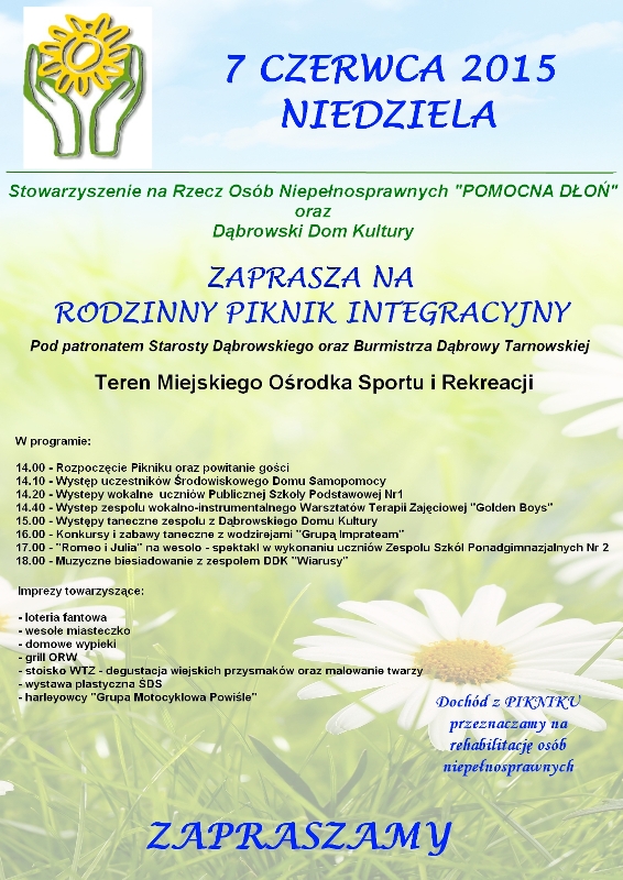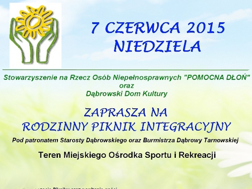 Stowarzyszenie na Rzecz Osób Niepełnosprawnych „Pomocna Dłoń” oraz Dąbrowski Dom Kultury zapraszają na Rodzinny Piknik Integracyjny pod patronatem Starosty Dąbrowskiego oraz Burmistrza Dąbrowy Tarnowskiej, który odbędzie się w dniu 7 czerwca br. na terenie Centrum Konferencyjno-Sportowego przy ul. Sportowej 4 w Dąbrowie Tarnowskiej. Dochód z pikniku zostanie przeznaczony na rehabilitację osób niepełnosprawnych.