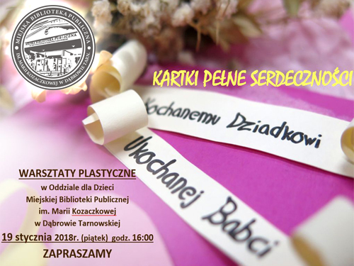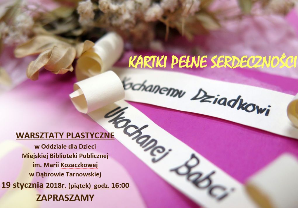 Zbliżające się dni to czas, kiedy w szczególny sposób możemy podziękować kochanym babciom i dziadkom za ich troskę, opiekę, rady ... Sposobów na to jest wiele, Oddział dla Dzieci w Miejskiej Bibliotece Publicznej im. Marii Kozaczkowej w Dąbrowie Tarnowskiej proponuje, aby wywołać uśmiech na ich twarzach obdarowując "kartkami pełnymi serdeczności" z ważnym słowem: Dziękuję. Dlatego też Oddział dla Dzieci zaprasza wszystkie chętne dzieci do udziału w warsztatach laurkowych w piątek 19 stycznia br. o godz. 16:00. Wstęp wolny.