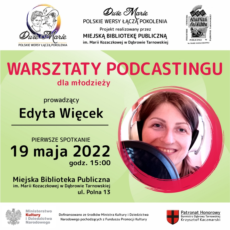 Miejska Biblioteka Publiczna im. Marii Kozaczkowej w Dąbrowie Tarnowskiej zaprasza chętnych uczniów szkół ponadpodstawowych z terenu gminy Dąbrowa Tarnowska do udziału w warsztatach podcastingu, organizowanych w ramach realizacji projektu "Dwie Marie - polskie wersy łączą pokolenia". Zajęcia odbywać się będą 19 i 26 maja o godz. 15:00, w Sali Audytoryjnej MBP. W spotkaniach zawarta zostanie teoretyczna i praktyczna wiedza z zakresu rejestracji dźwięku. Zaowocuje to powstaniem odcinka bibliotecznego podcastu pt. „Z poezją dorastanie”. W wywiadzie przeprowadzonym przez jednego z uczestników zajęć z córką i wnuczką Marii Kozaczkowej poznamy poetkę od strony prywatnej. Warsztaty prowadzone będą przez Edytę Więcek, bibliotekarkę pracującą w Dziale dla Dorosłych i Młodzieży MBP i autorkę serii podcastów „Bibliowrotek”.