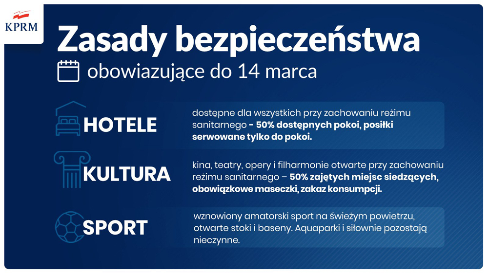 - Hotele – dostępne dla wszystkich przy zachowaniu reżimu sanitarnego (50% dostępnych pokoi, posiłki serwowane tylko do pokoi, na życzenie gości. Restauracje hotelowe – zamknięte).