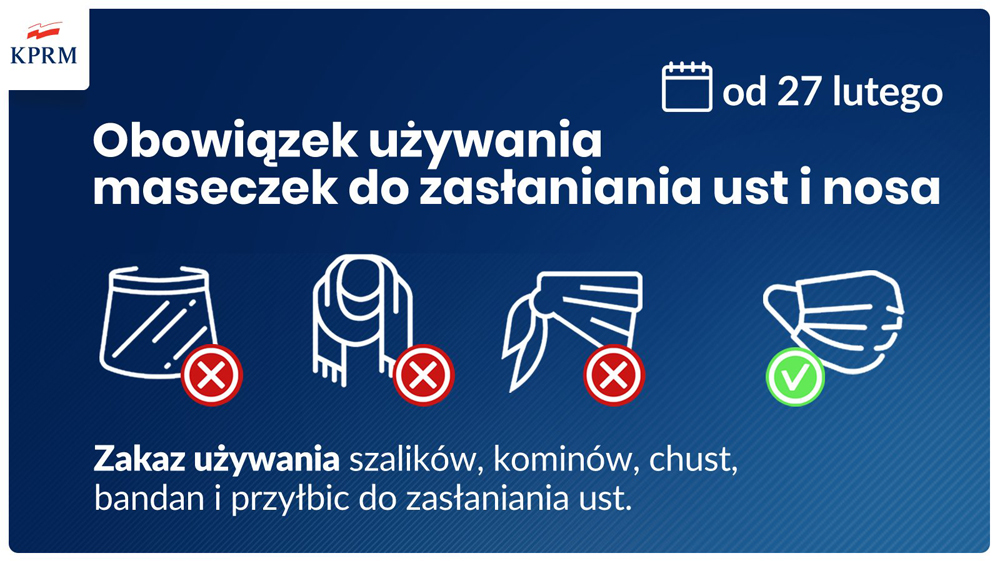 W Polsce w ostatnim czasie odnotowujemy wzrost zakażeń COVID-19. Przekroczyliśmy barierę 10 tys. nowych przypadków dziennie. Rośnie liczba zajętych łóżek i respiratorów w szpitalach oraz liczba zleconych testów. W województwie warmińsko-mazurskim sytuacja epidemiczna jest szczególnie trudna, dlatego od 27 lutego zaostrzone zostają zasady bezpieczeństwa w tym regionie. Na nowo zamknięte zostaję: hotele, galerie handlowe, placówki kulturalne, a klasy I-III szkoły podstawowej powrócą do nauki zdalnej. W pozostałych województwach przedłużone będą dotychczasowe zasady bezpieczeństwa do 14 marca. Ze względu na niepokojącą sytuację epidemiczną u naszych sąsiadów, od 27 lutego wszystkie osoby wracające z Czech i Słowacji zostaną skierowane na kwarantannę. Tempo narastania trzeciej fali lub jej zatrzymanie zależy od naszego zachowania. Aby ograniczyć ryzyko rozprzestrzeniania się wirusa, wprowadzony zostaje zakaz używania m.in. przyłbic i chust do zakrywania ust i nosa. Od 27 lutego dozwolone będą maseczki, które najlepiej chronią nas przed zarażeniem.