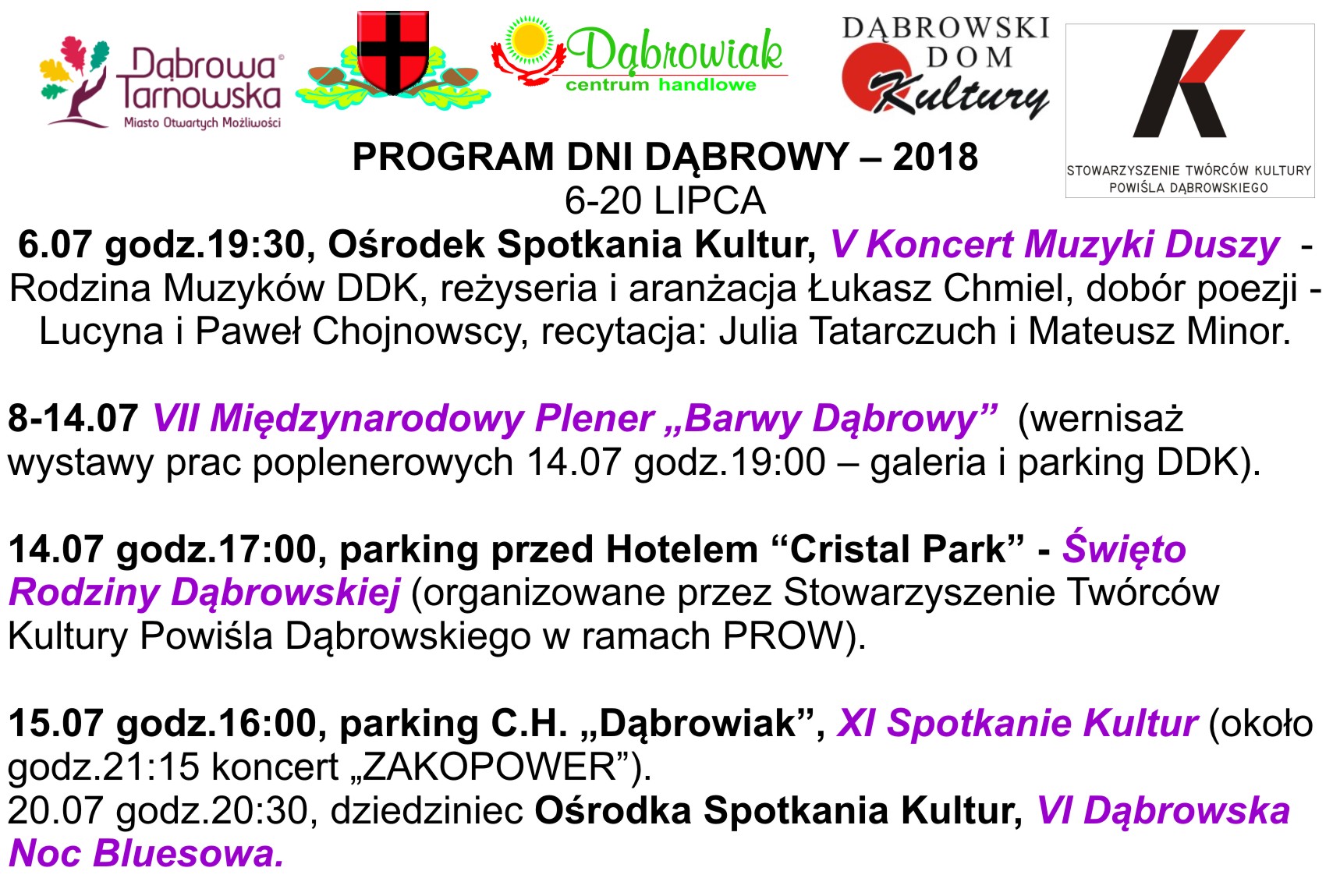 W lipcu w Dąbrowie Tarnowskiej odbywają się dni naszego miasta. Od ponad 10 lat na parkingu C.H. „Dąbrowiak” rozbrzmiewają różne rytmy, posłuchać można wielu stylów, podziwiać umiejętności taneczne, instrumentalne i wokalne, oglądać pokazy w ramach „Spotkania Kultur” – filaru Dni Dąbrowy. Ale święto miasta to nie tylko impreza masowa w sercu osiedla Westerplatte. Tegoroczne składniki – jak sama nazwa wskazuje na liczbę mnogą – świętowania stolicy powiatu: V Koncert Muzyki Duszy (Ośrodek Spotkania Kultur, piątek 6.07 godz. 19:30), XI Spotkanie Kultur 15.07 od godz. 16:00, VI Dąbrowska Noc Bluesowa (dziedziniec OSK, piątek 20.07 godz. 20:30), a także zupełnie nowa propozycja integracji społecznej – Święto Rodziny Dąbrowskiej organizowane przez Stowarzyszenie Twórców Kultury Powiśla Dąbrowskiego w sobotę 14.07 o godz. 17:00 na parkingu przed Hotelem „Cristal Park”. Ważnym segmentem kulturotwórczym jest kolejna, VII edycja Międzynarodowego Pleneru Malarsko-Rzeźbiarskiego „Barwy Dąbrowy” (8-14.07) z udziałem kilkunastu artystów z Polski i Białorusi.