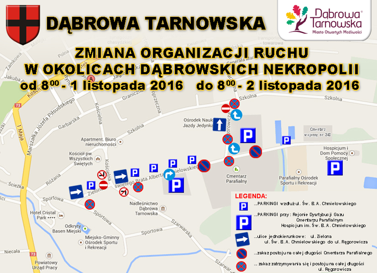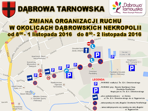 Podobnie jak w latach ubiegłych, w okresie Świąt  Wszystkich Świętych, tj. w dniach 1 listopada 2016 r. od godz. 800  do 2 listopada 2016 r. do godz. 800 wprowadzona została zmiana organizacji ruchu w obrębie  cmentarza parafialnego w Dąbrowie Tarnowskiej. Zachęcamy do zapoznania się z tymi zmianami i nowych zasad organizacji ruch w obrębie dąbrowskich nekropolii oraz stosowanie się do poleceń Policji.