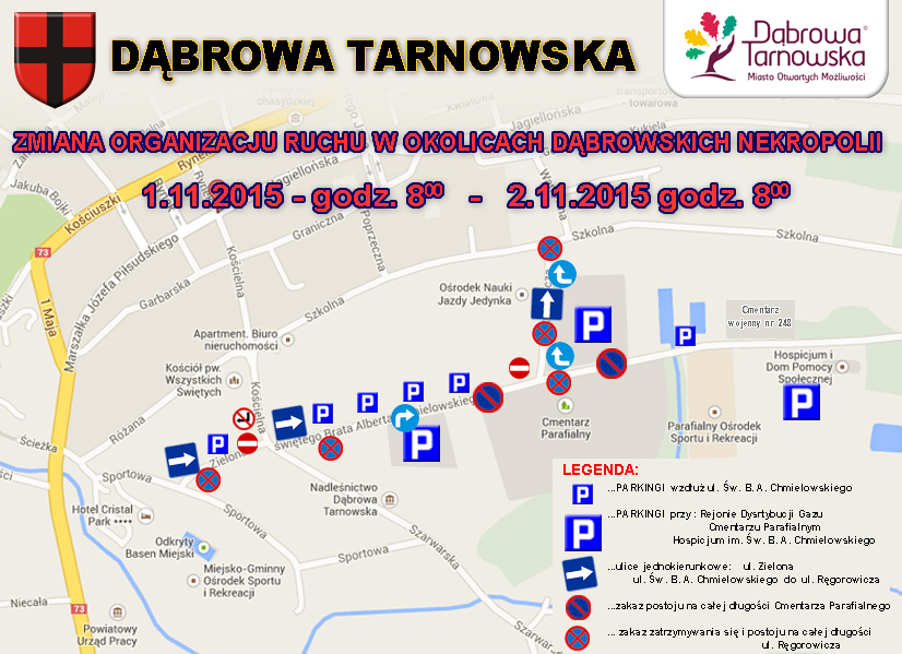 Podobnie jak w latach ubiegłych, w okresie Świąt  Wszystkich Świętych, tj. w dniach 1 listopada 2015 r. od godz. 800  do 2 listopada 2015 r. do godz. 800 wprowadzona została zmiana organizacji ruchu w obrębie  cmentarza parafialnego w Dąbrowie Tarnowskiej. Zachęcamy do zapoznania się z tymi zmianami i nowych zasad organizacji ruch w obrębie dąbrowskich nekropolii oraz stosowanie się do poleceń Policji.
