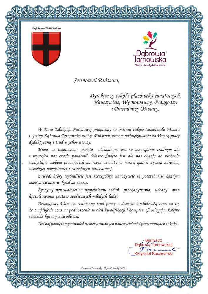 W Dniu Edukacji Narodowej pragniemy w imieniu całego Samorządu Miasta i Gminy Dąbrowa Tarnowska złożyć Państwu szczere podziękowania za Waszą pracę dydaktyczną i trud wychowawczy. Mimo, że tegoroczne święto obchodzone jest w szczególnie trudnym dla wszystkich nas czasie pandemii, Wasze Święto jest dla nas okazją do złożenia wszystkim osobom pracujących na rzecz oświaty w naszej gminie życzeń zdrowia, wszelkiej pomyślności i satysfakcji zawodowej. Zawód, który wybraliście jest szczególny; nauczyciele są potrzebni w każdym miejscu świata w każdym czasie. Życzymy wytrwałości w wypełnianiu zadań przekazywania wiedzy oraz kształtowania postaw społecznych młodych ludzi. Dziękujemy Wam za codzienny trud pracy z dziećmi i młodzieżą oraz za to, że znajdujecie czas na podnoszenie swoich kwalifikacji i kompetencji osiągając kolejne szczeble kariery zawodowej. Dzisiaj pamiętamy również o emerytowanych nauczycielach i pracownikach szkoły.